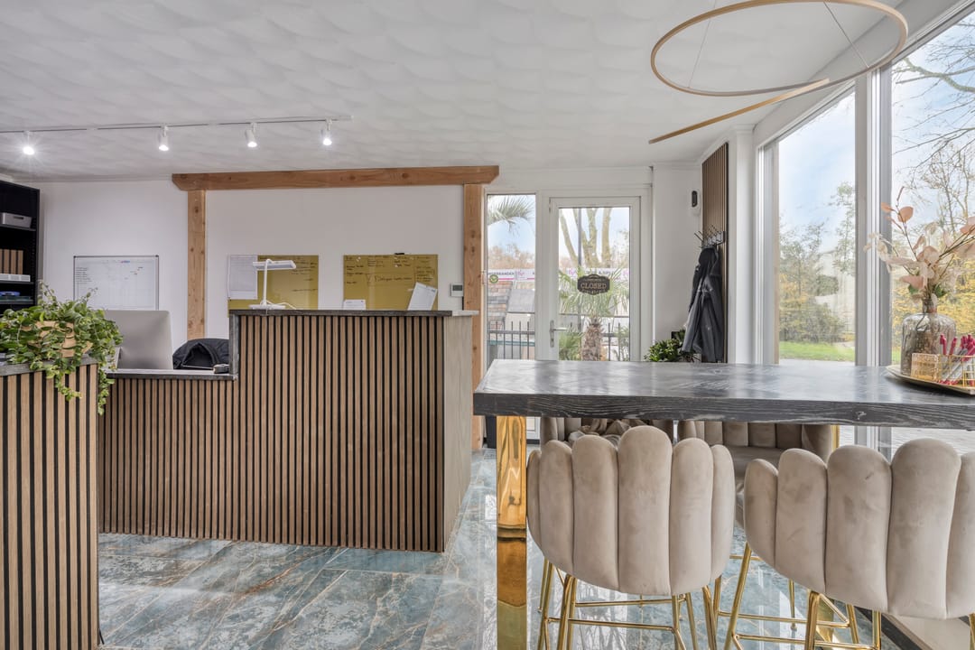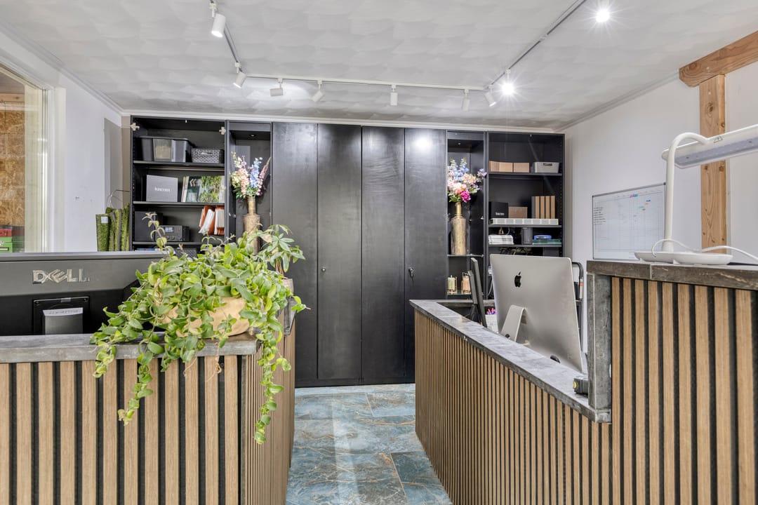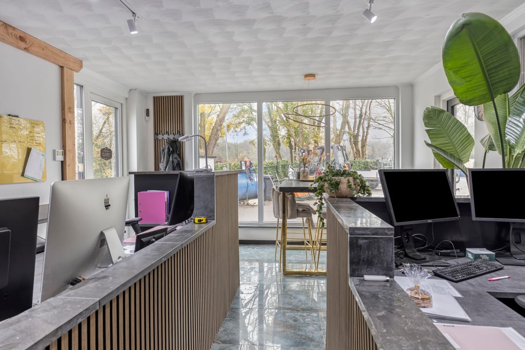 Centraal in de hal vindt u de werkplaats van circa 42 m². Deze ruimte is praktisch ingericht. Aangrenzend bevindt zich het hoogwaardige kantoor, dat is afgewerkt met plavuizen, strakke wanden en een hoogwaardig plafond met waaierstukwerk en stijlvolle plafondlijsten. De verlichting bestaat uit geïntegreerde plafondspots in combinatie met een sfeerlamp, wat een representatieve en professionele werkomgeving creëert.