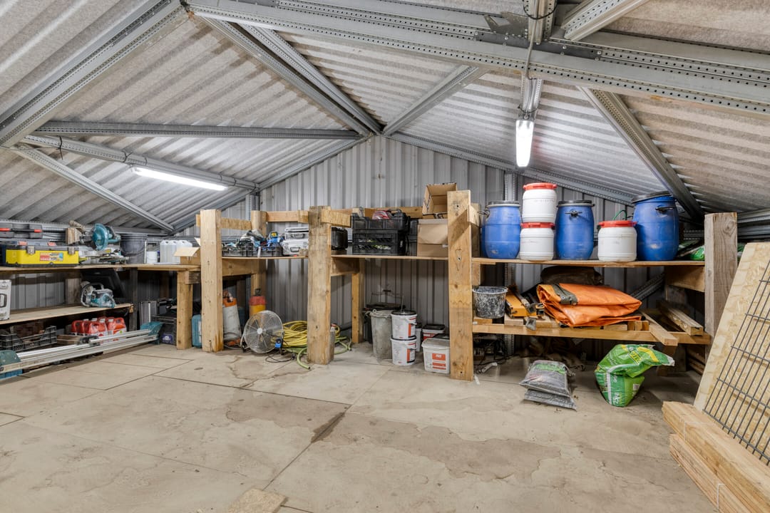 Bij binnenkomst betreedt u direct het gedeeltelijk geïsoleerde magazijn. De wanden zijn rondom voorzien van isolatie en in deze ruimte bevindt zich tevens de meterkast. Het magazijn biedt een overzichtelijke opstelling voor opslag, materialen en logistieke voorzieningen.
