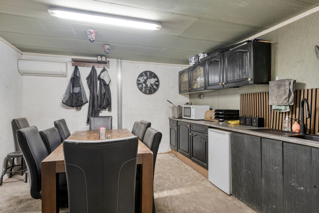 Op de begane grond bevindt zich de kantine, een goed geïsoleerde en prettig ingedeelde ruimte die is uitgerust met een compact keukenblok met wasbak, koelkast en klimaatbeheersing via een airco-installatie. Direct naast de kantine ligt het separate toilet voor medewerkers.