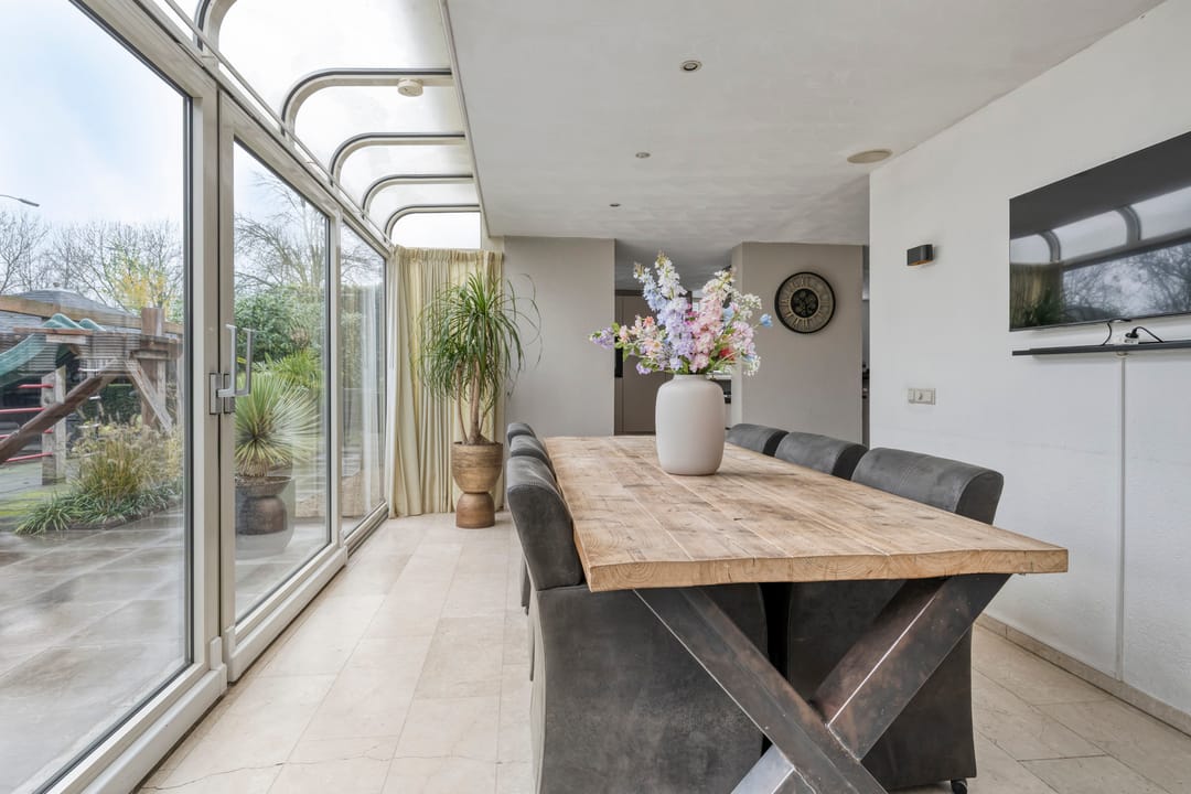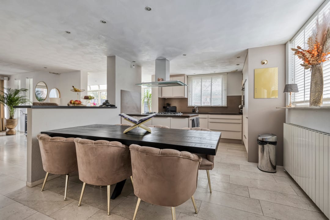 De benedenverdieping is volledig voorzien van een marmeren vloer en beschikt over een recent vernieuwde moderne keuken, uitgerust met hoogwaardige inbouwapparatuur en een gasfornuis van het topmerk Gaggenau. Dankzij de serre met vloerverwarming kun je hier het hele jaar door genieten van het zonlicht — ideaal voor zowel het voorjaar als het najaar.