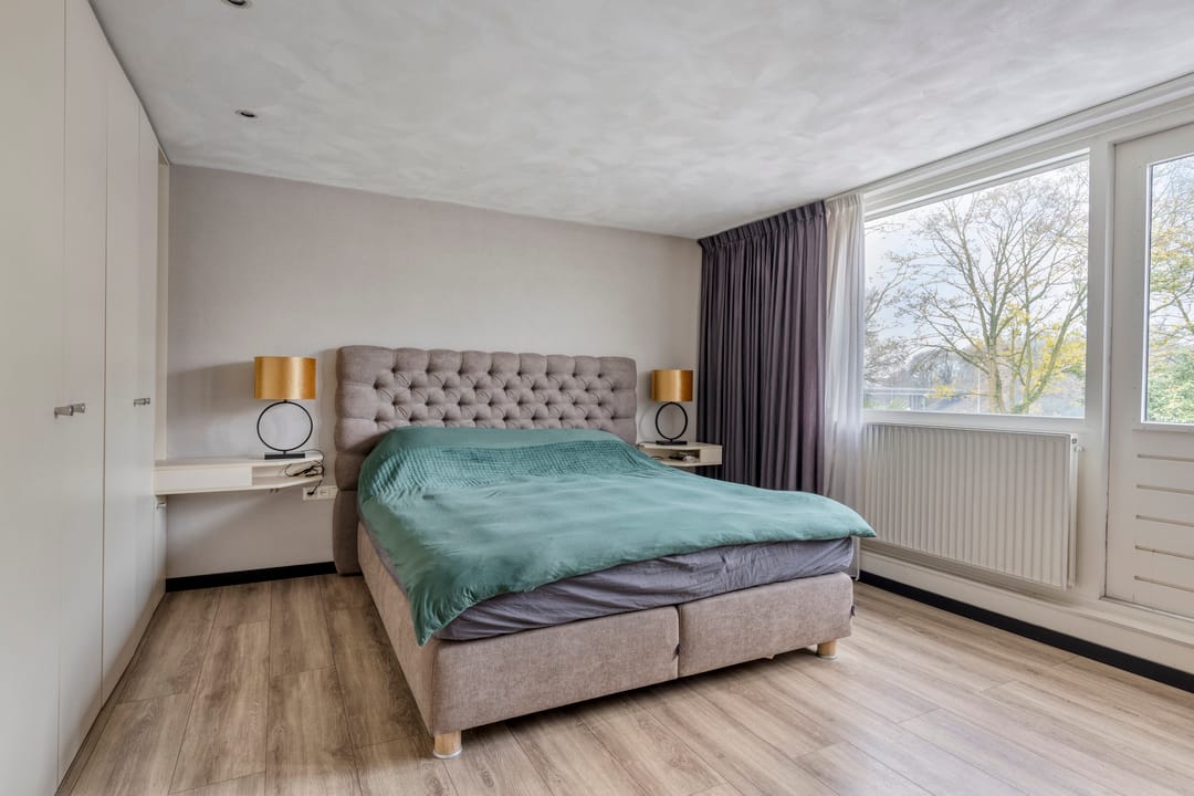 Vanuit de masterbedroom stap je direct het ruime balkon op, met een prachtig uitzicht over de fraai aangelegde tuin met vijver. Een fantastische plek om ’s ochtends in stilte te genieten van de eerste zonnestralen.