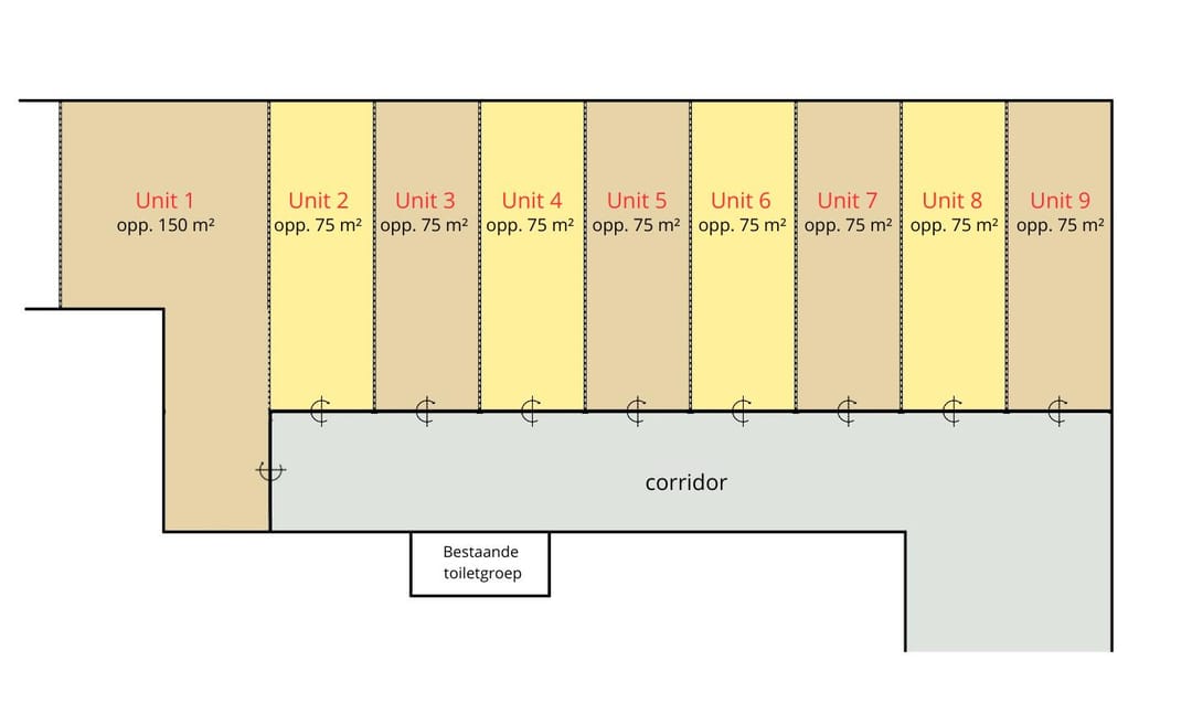 - 1 unit van ca. 150 m² en 6 units van ca. 75 m²