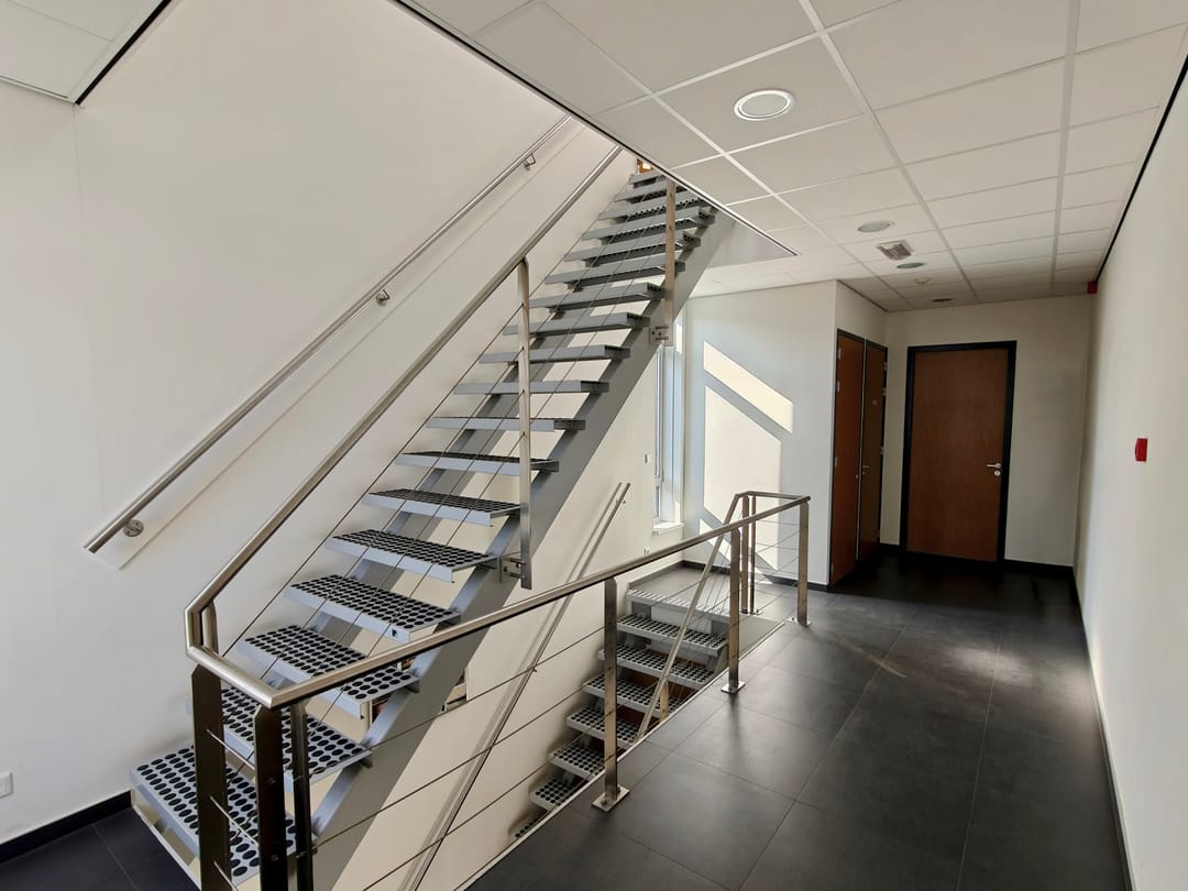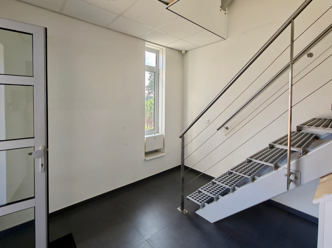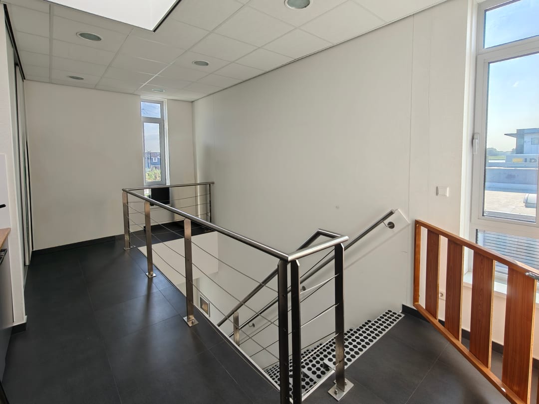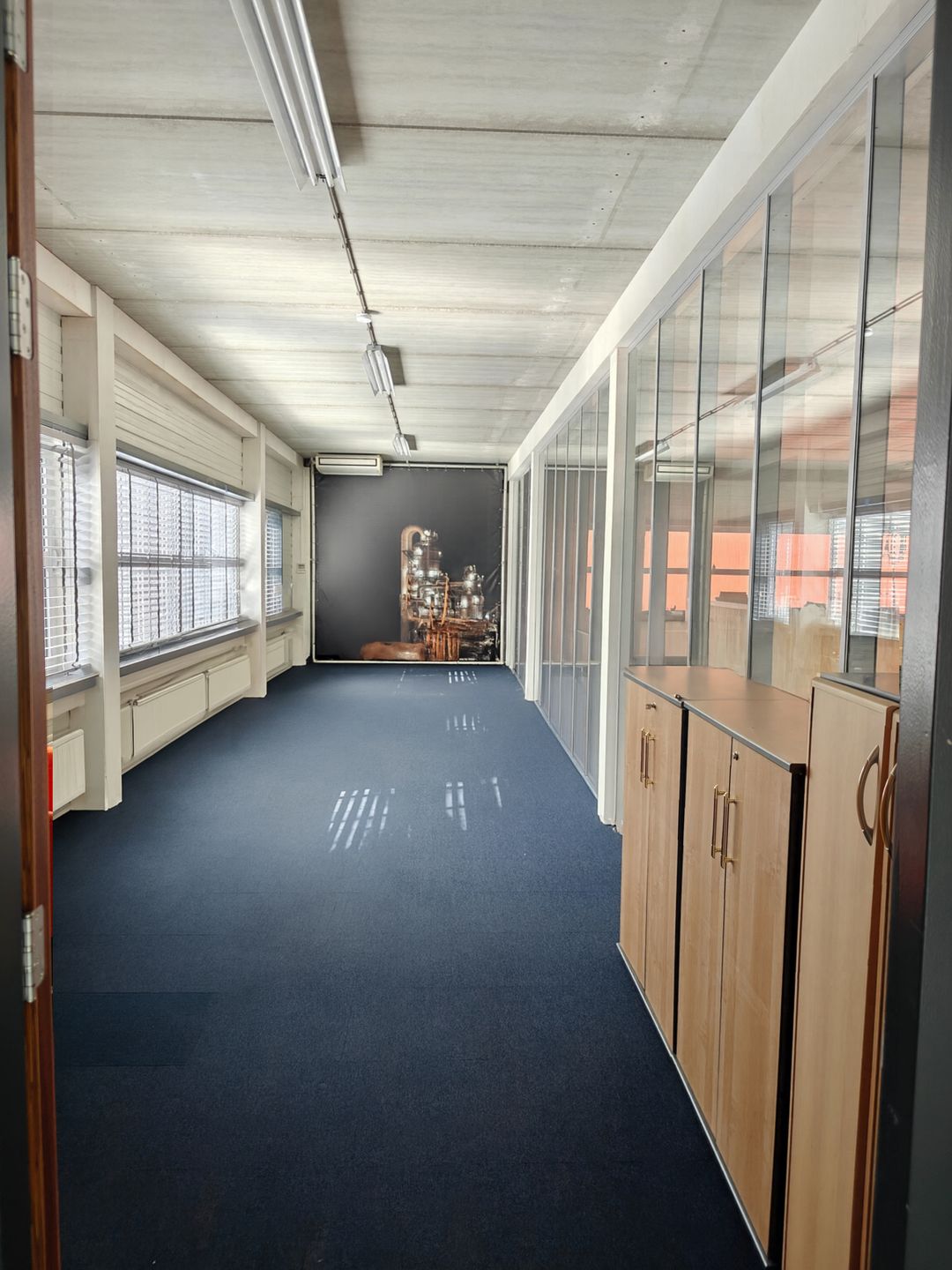 Gang (afm. ca. 7.85 x 3.25, minus trapgat van ca. 6 m2, plafondhoogte ca. 2.75 m.), bergkast, modern toilet. Kantoorruimte (plafondhoogte ca. 3.25 m.) met daglicht en glazen pui als afscheiding met de bedrijfshal.