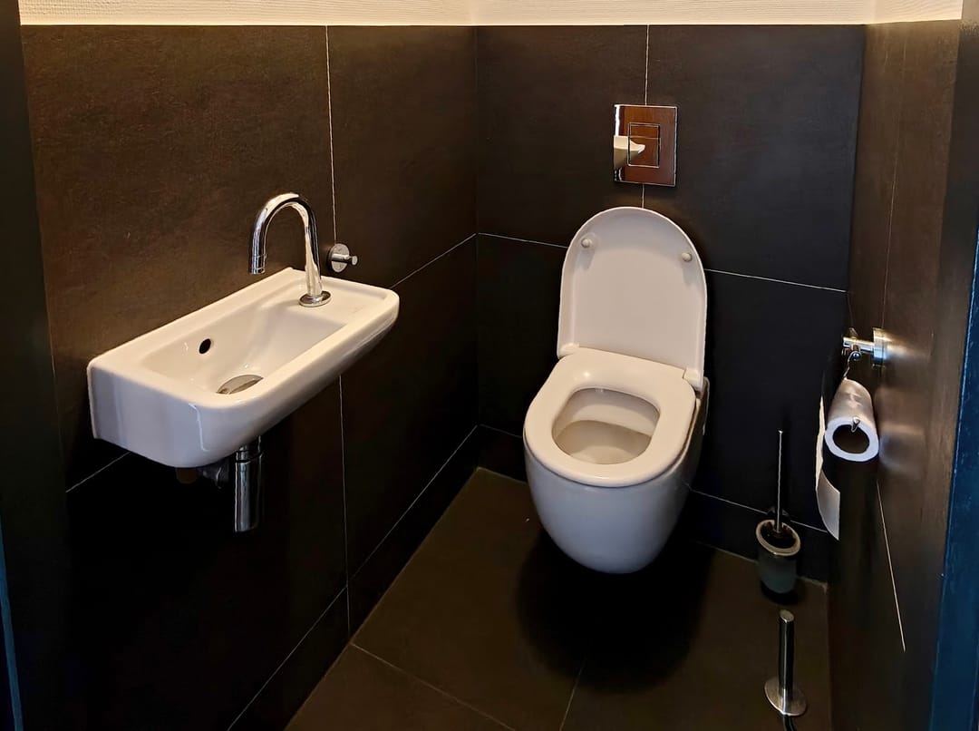 • Modern toilet met gedeeltelijk betegelde wanden, wit sanitair, hangcloset, fontein, verlaagd vinyl systeemplafond met inbouwspots;