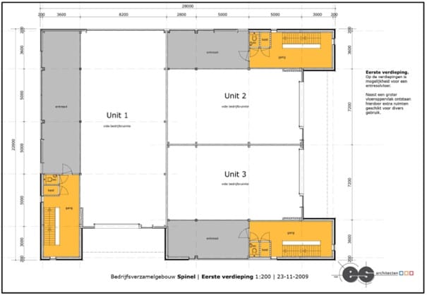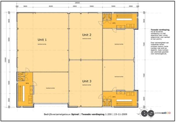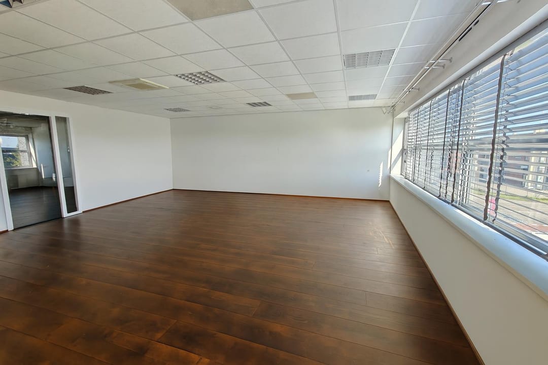 Gang (afm. ca. 7.85 x 3.25, minus trapgat van ca. 6 m2), lichtkoepel, 2 moderne toiletten (dames en heren), opstelplaats luxe keukenblokje, schuifkastenwand met hierachter de technische installaties. Grote kantoorruimte (afm. ca. 13.30 x 11.30 m.). Kleine kantoorruimte/ directiekantoor (afm. ca. 7.05 x 7.65/ 7.95 m.).