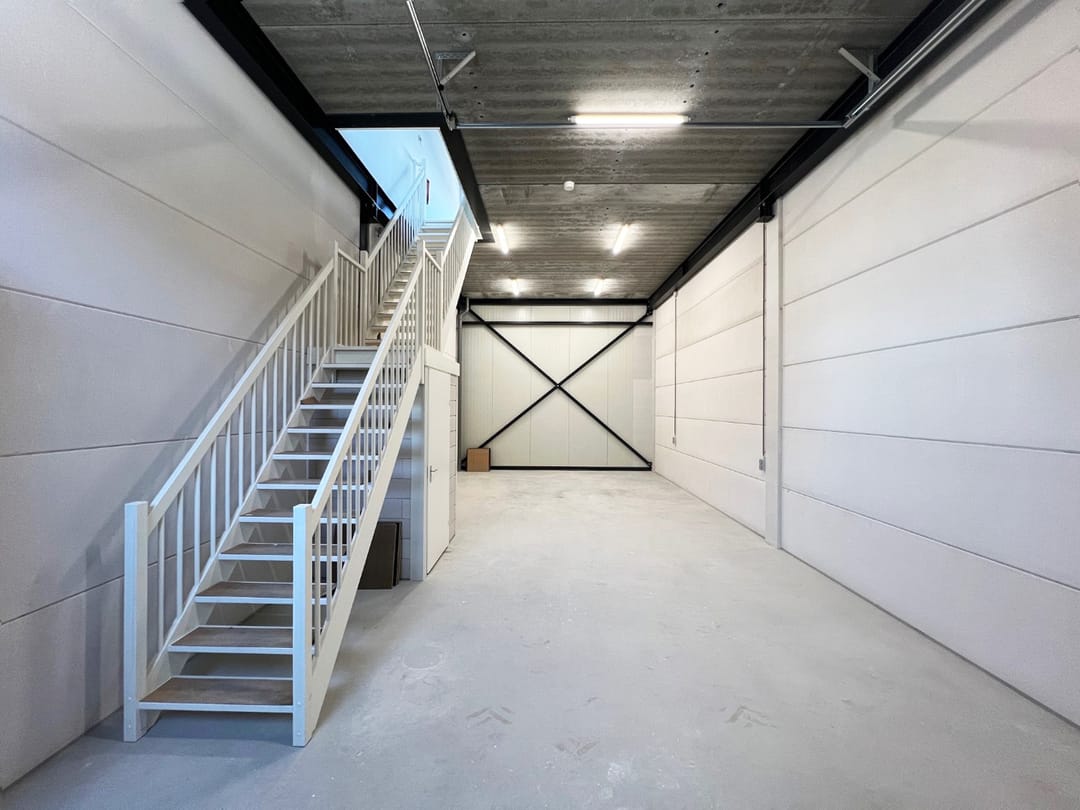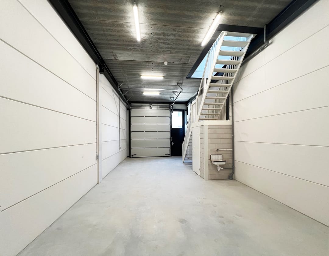 - Overheaddeuren, betonvloer, toilet, pantry, airconditioning en te openen ramen