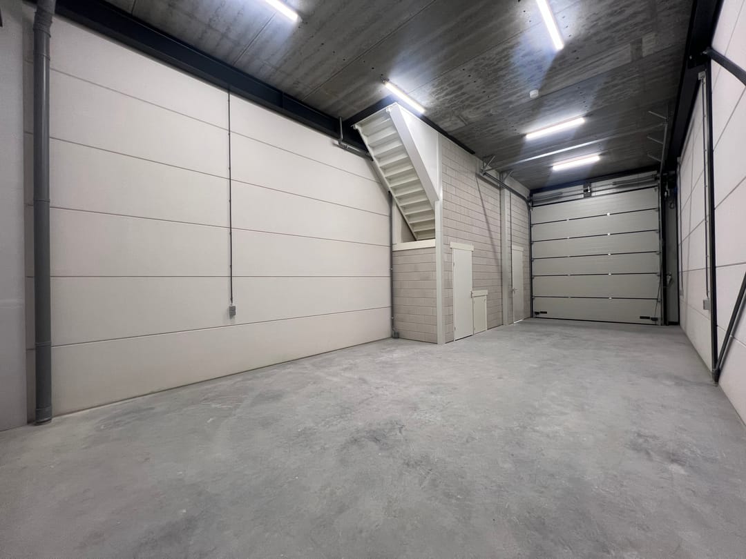 - Overheaddeuren, betonvloer, toilet, pantry en inbouwarmaturen