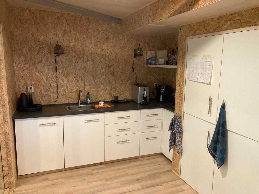 -1e verdieping (met centrale verwarming): 2 x vaste trap, kantine/kantoorruimte, keukenruimte met keurig keukenblok