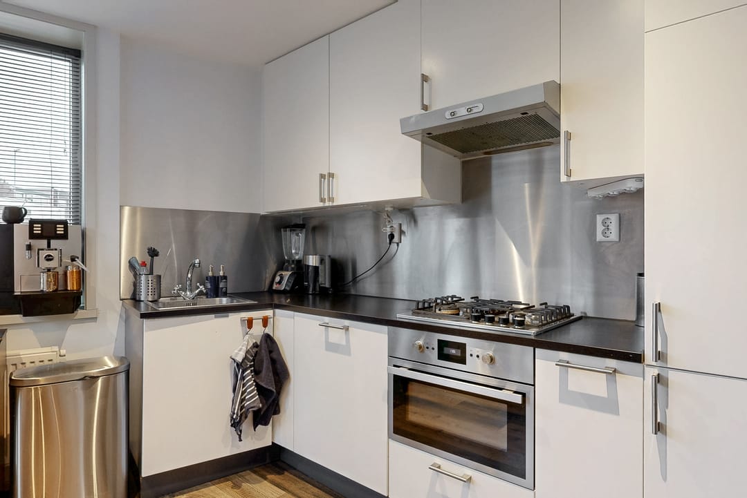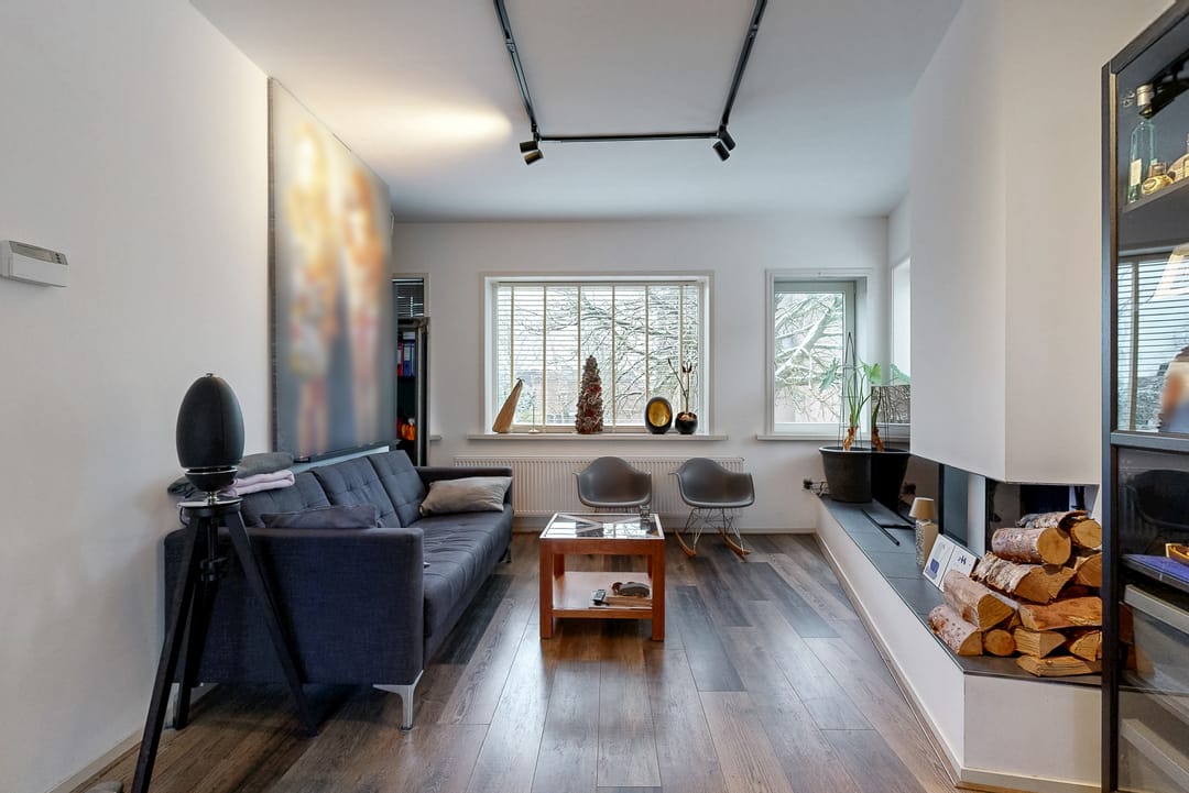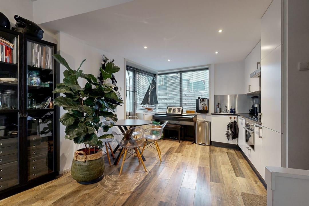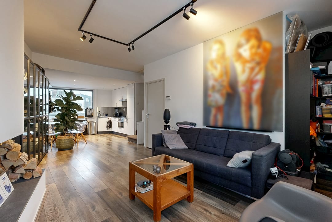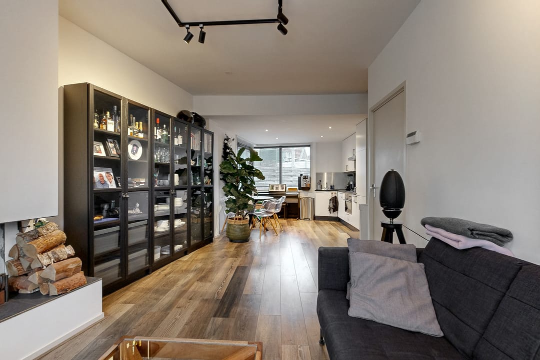 Entree woning; woonkamer met open haard en toegang tot het ruime dakterras van circa 21 m2; moderne open keuken voorzien van gaskookplaat, oven, koelkast, vriezer, afzuigkap en vaatwasser.