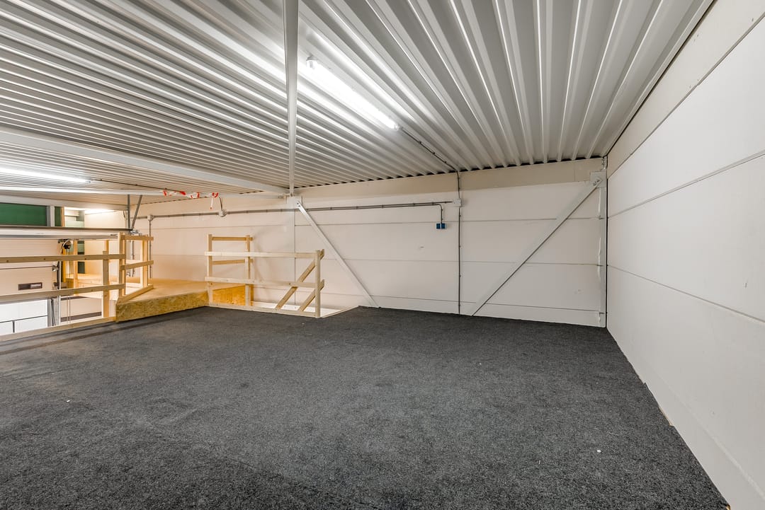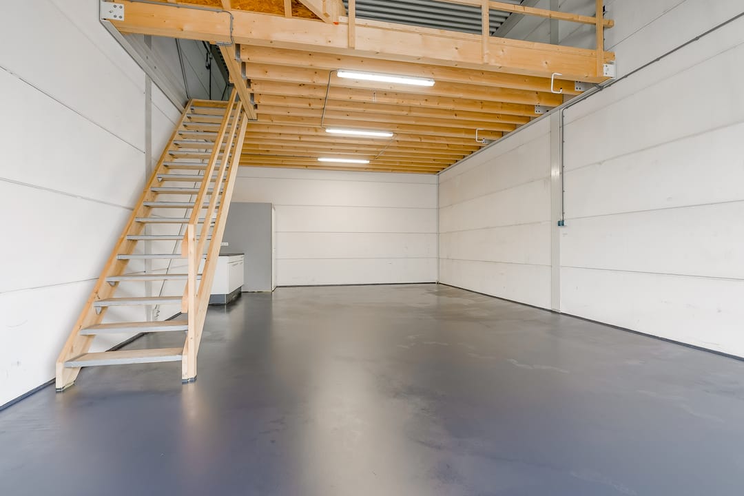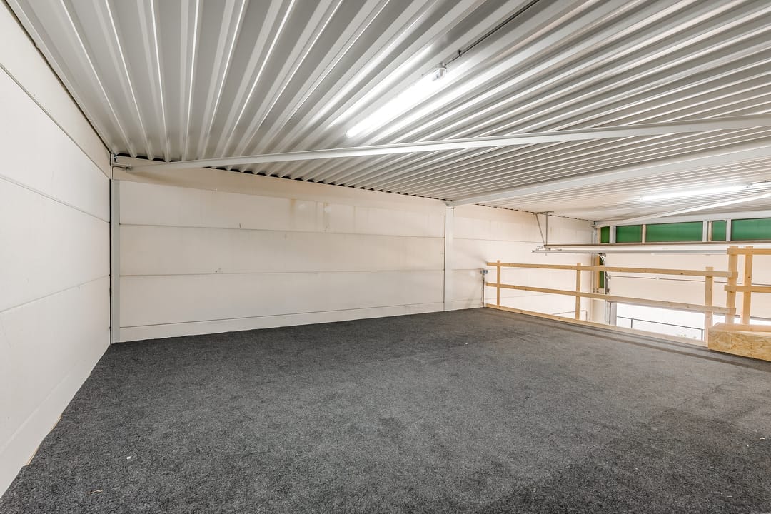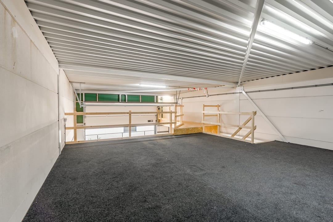 Via de interne trap bereikt u de vide, die uitstekend gebruikt kan worden als extra werkruimte, opslaf of kantoorruimte. Dankzij de open opzet en de goede lichtinval is de ruimte flexibel in te delen en geschikt voor uiteenlopende bedrijfsactivititen.
