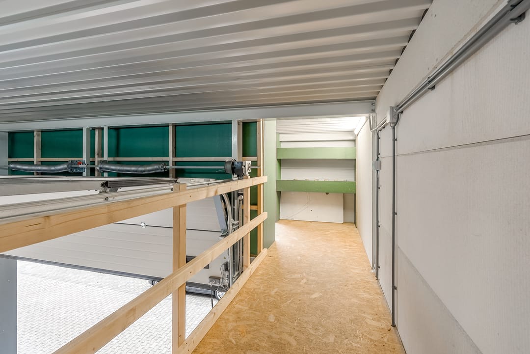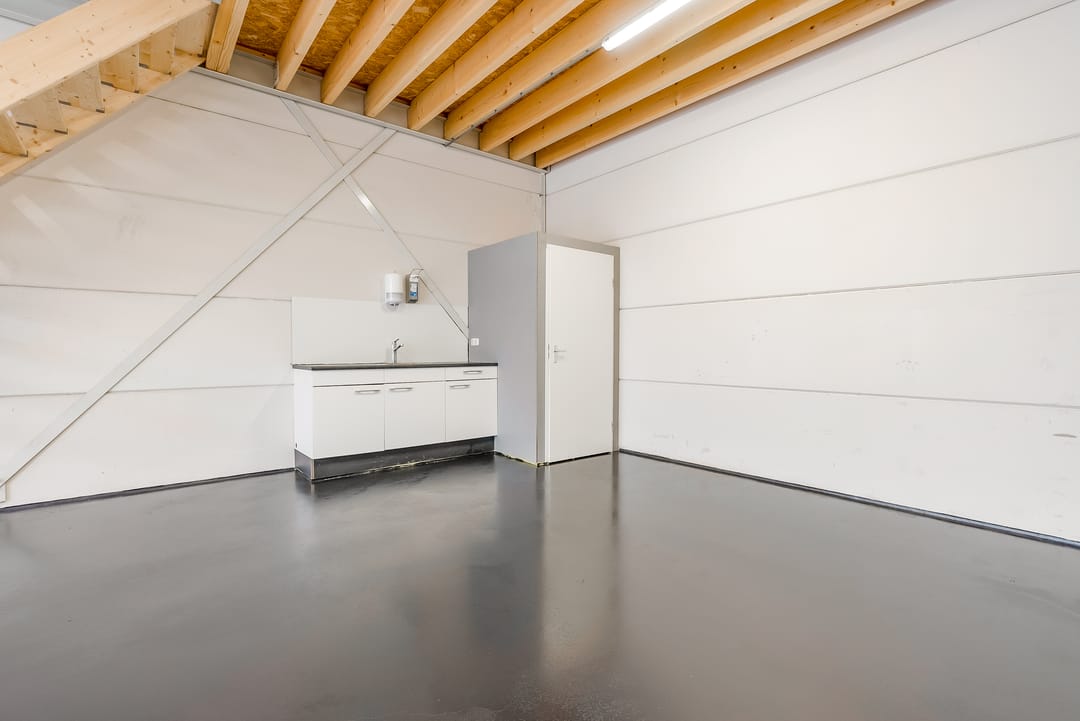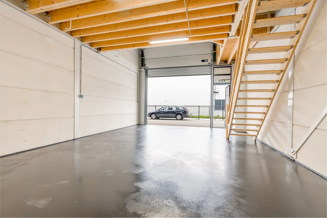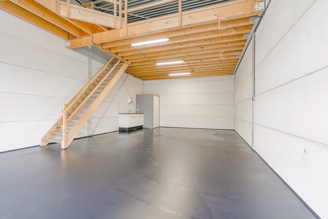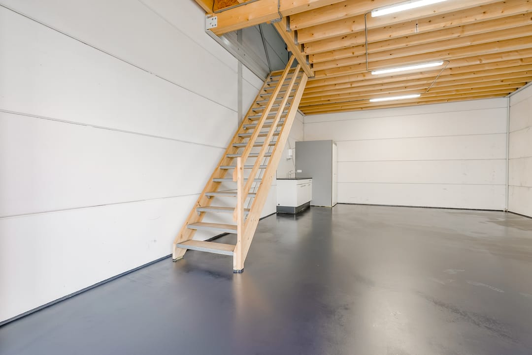 Via de interne trap bereikt u de vide, die uitstekend gebruikt kan worden als extra werkruimte, opslaf of kantoorruimte. Dankzij de open opzet en de goede lichtinval is de ruimte flexibel in te delen en geschikt voor uiteenlopende bedrijfsactivititen.
