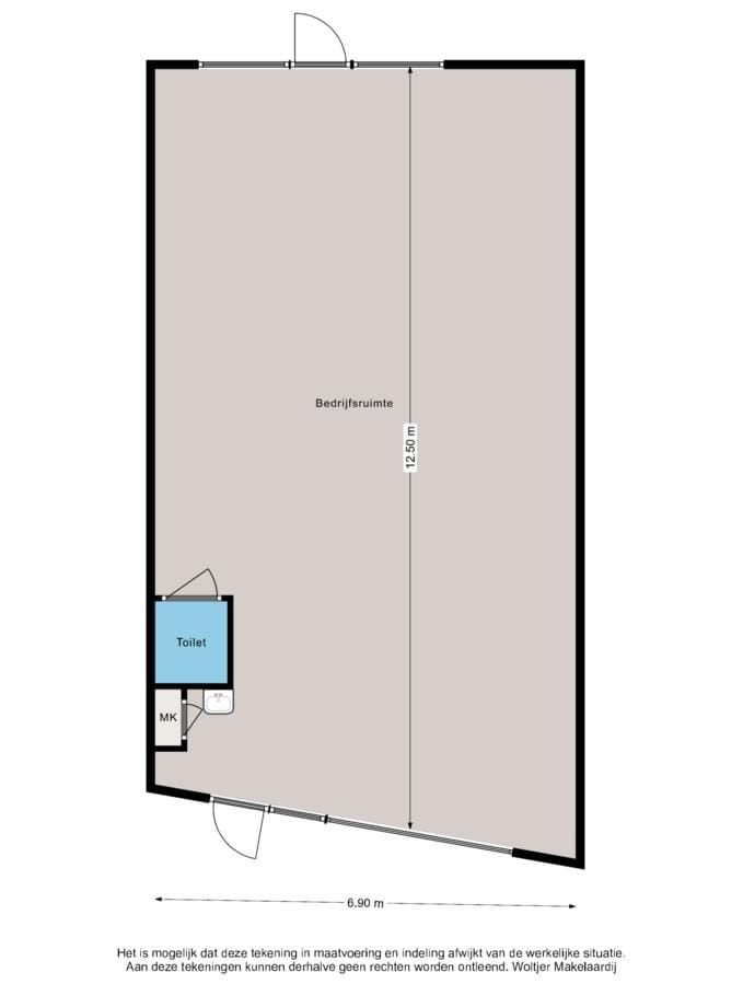 De entree is toegankelijk via een aparte loopdeur en een overheaddeur, wat laden en lossen eenvoudig maakt. De ruimte beschikt over een toilet, uitstortgootsteen en een meterkast met krachtstroomaansluiting. Praktisch en efficiënt opgezet voor diverse bedrijfsactiviteiten.
