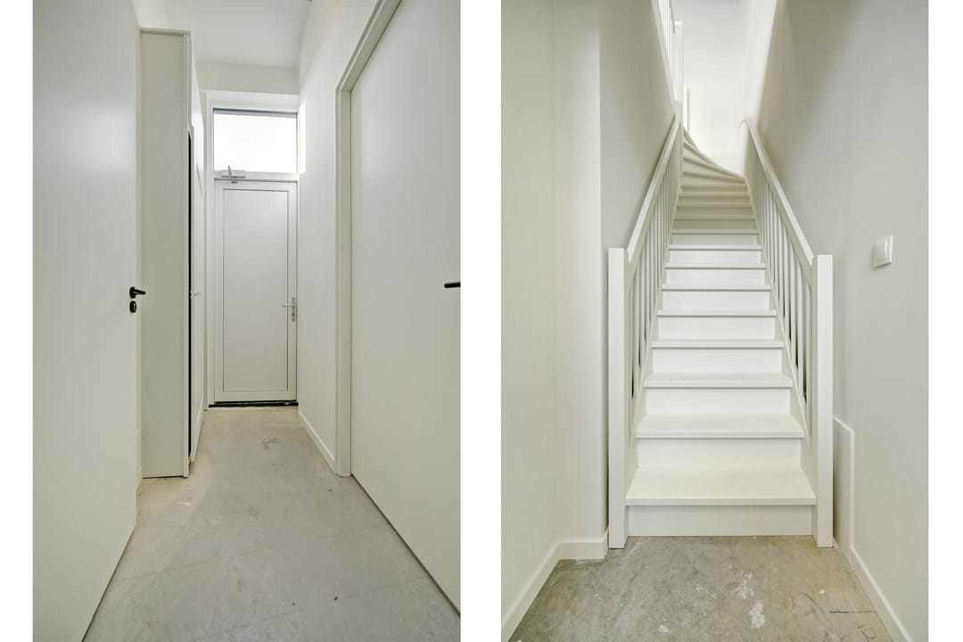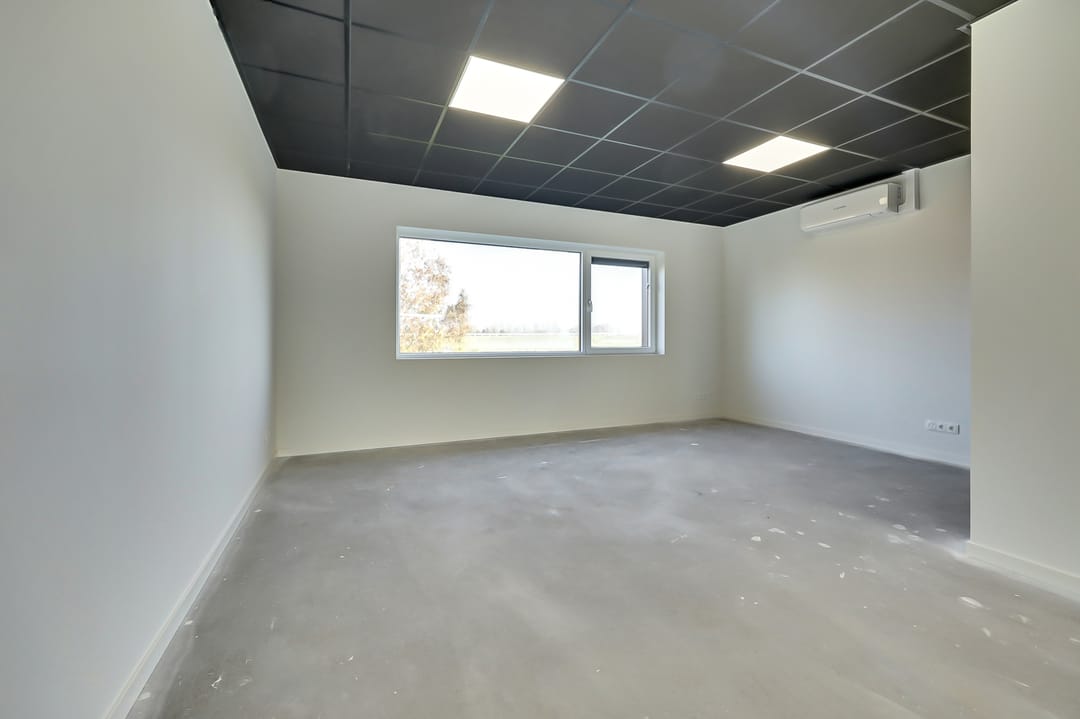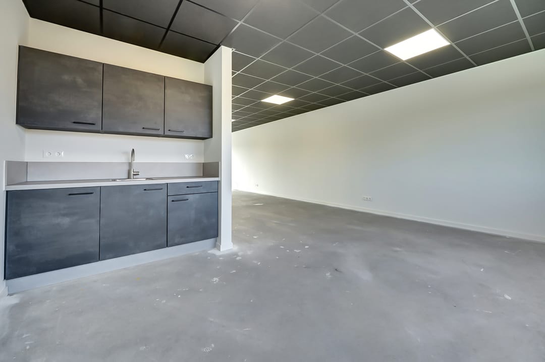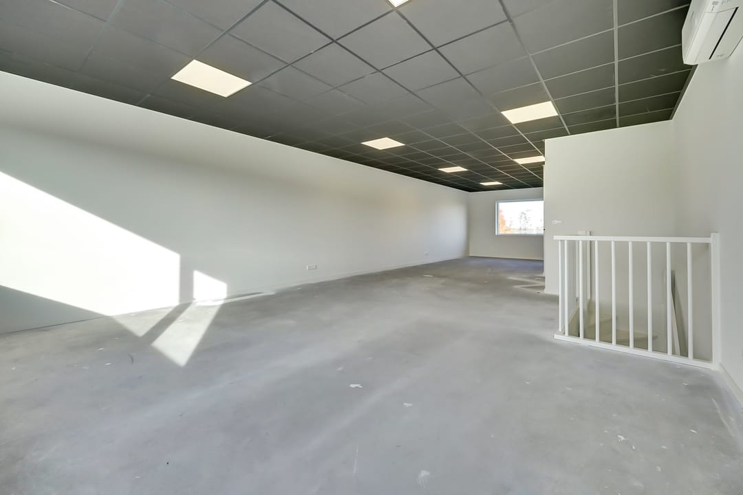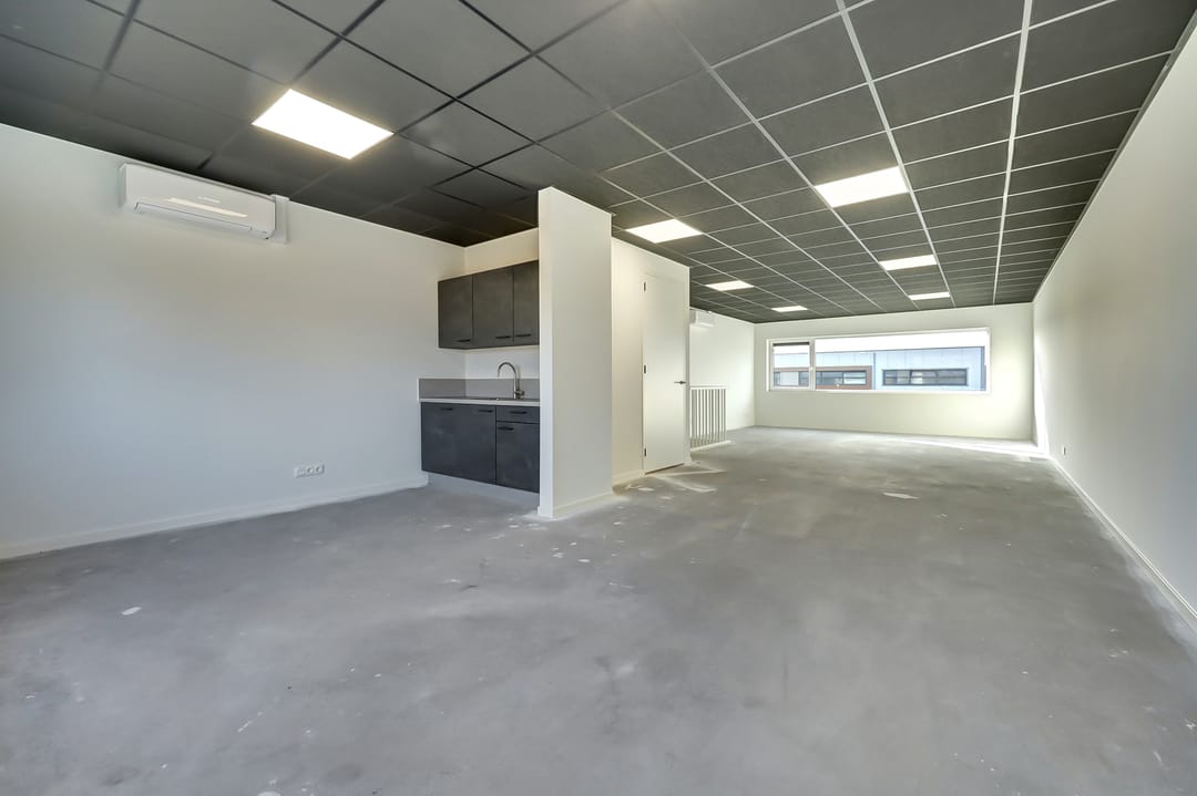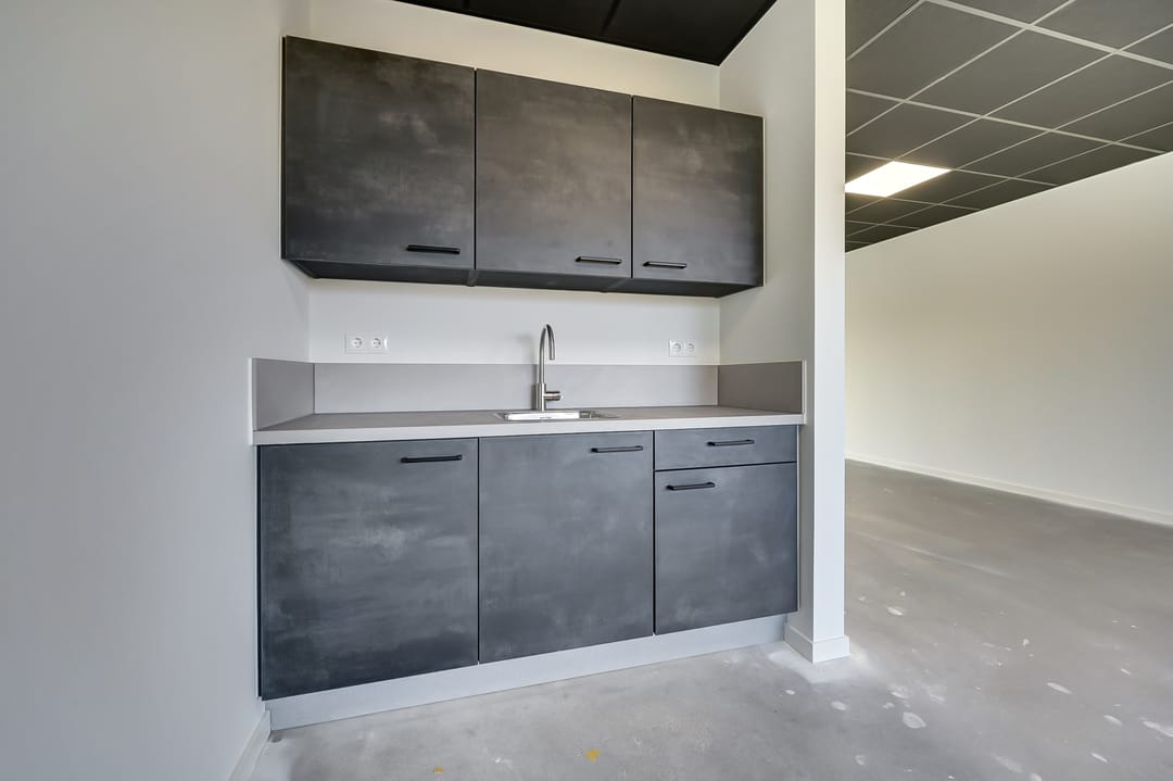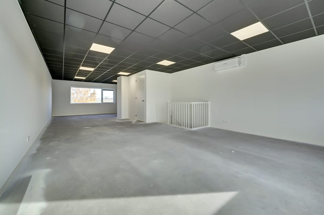 In tegenstelling tot de casco varianten zijn deze twee units reeds luxe afgewerkt. Zo is de trapopgang volledig afgetimmerd en is op de verdieping een strak, modern zwart systeemplafond aangebracht. Bovendien zijn hier een separate toiletruimte en een pantry gerealiseerd, ideaal voor het creëren van een volwaardige kantoorverdieping. De wanden boven zijn netjes afgewerkt en er is een airco-unit geplaatst, waardoor de ruimte zowel comfortabel als representatief is en direct in gebruik kan worden genomen.