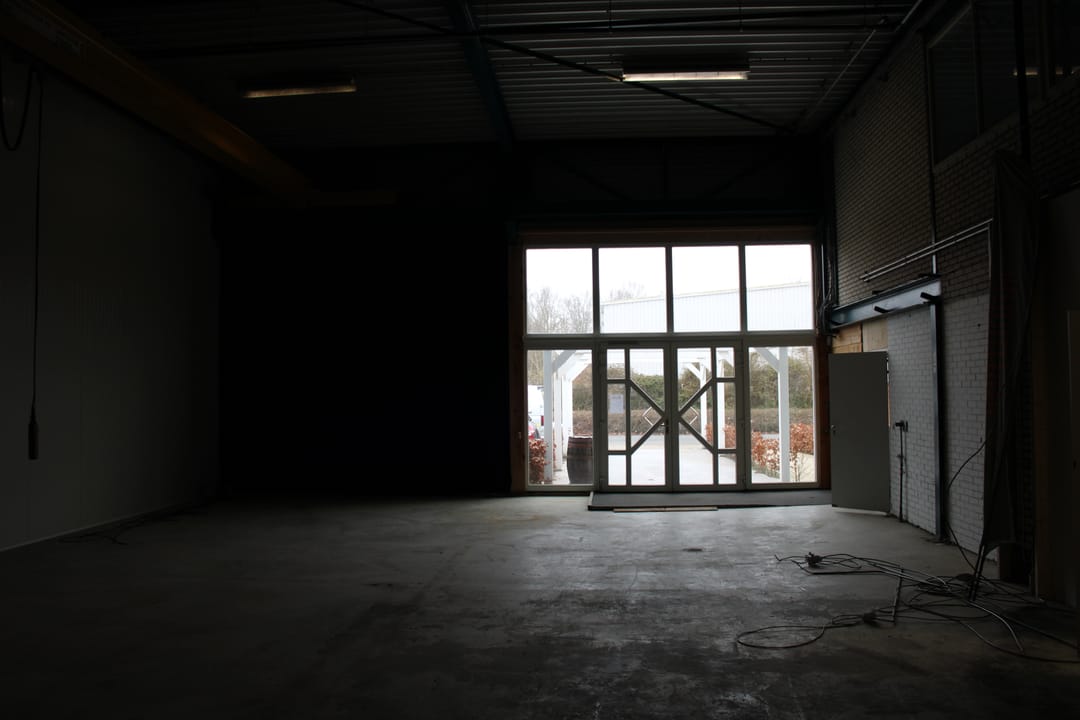 Deze hal is in gebruik geweest als showroom en heeft toegang middels een glaspui met openslaande deuren en een mooie buiten entree. In plaats van deze entree zou er weer een overheaddeur in kunnen zoals de andere overheaddeur.