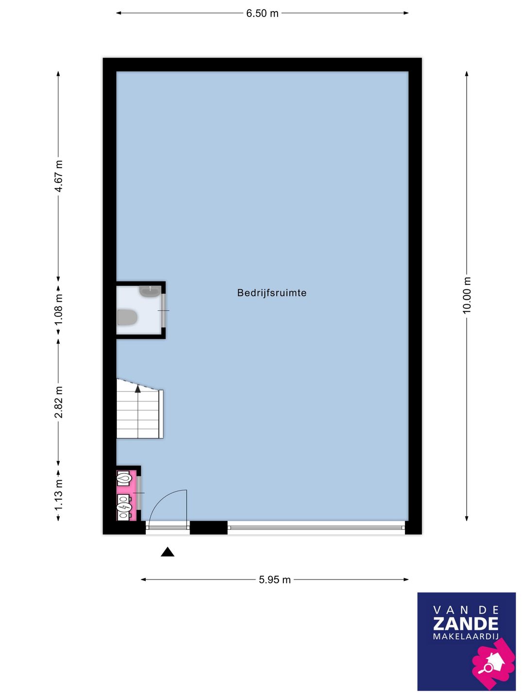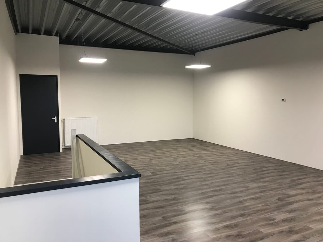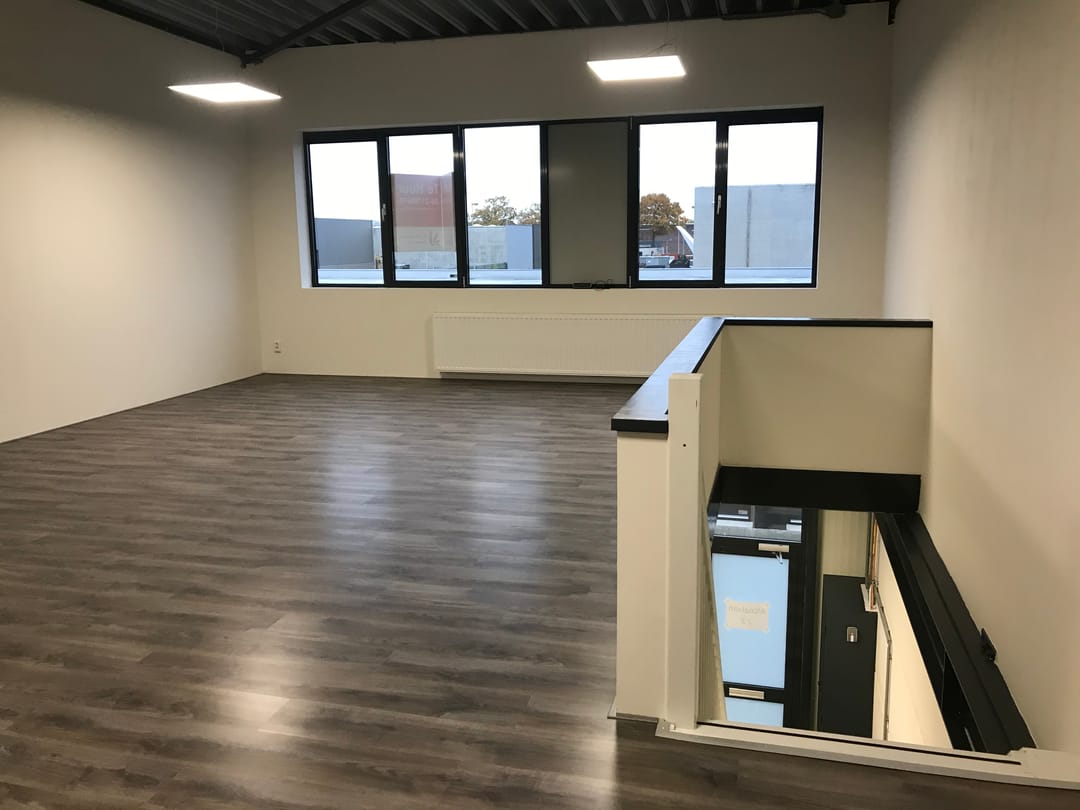 Entree, open bedrijfsruimte met toilet, trapopgang naar verdieping (kantoorruimte).