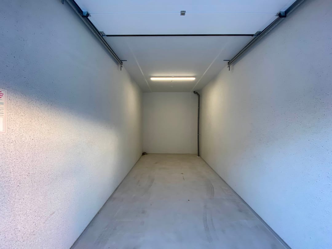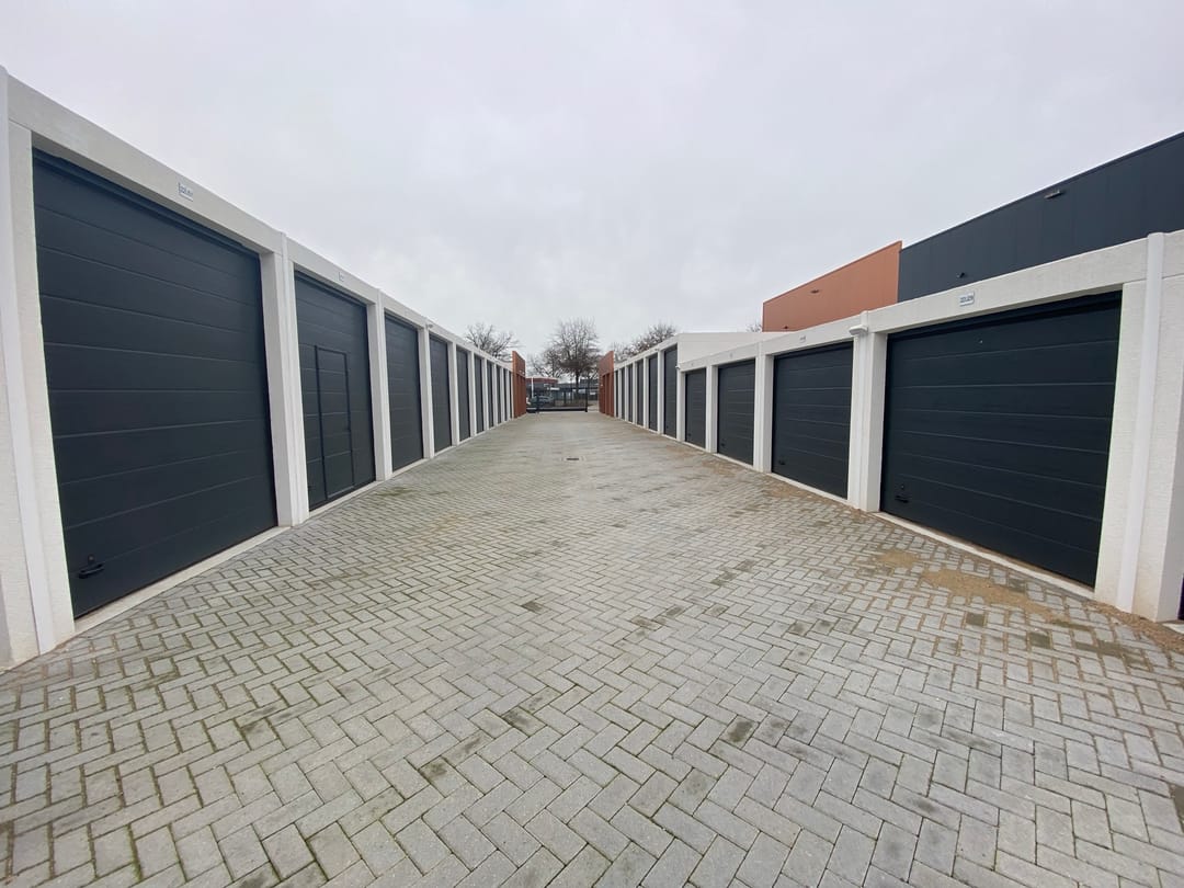 Garagebox op een afgesloten, beveiligd terrein met algemene parkeerplaatsen aan de voorzijde.