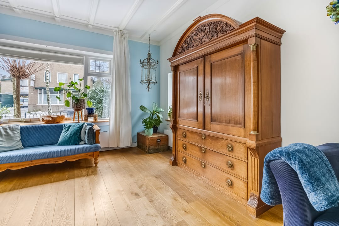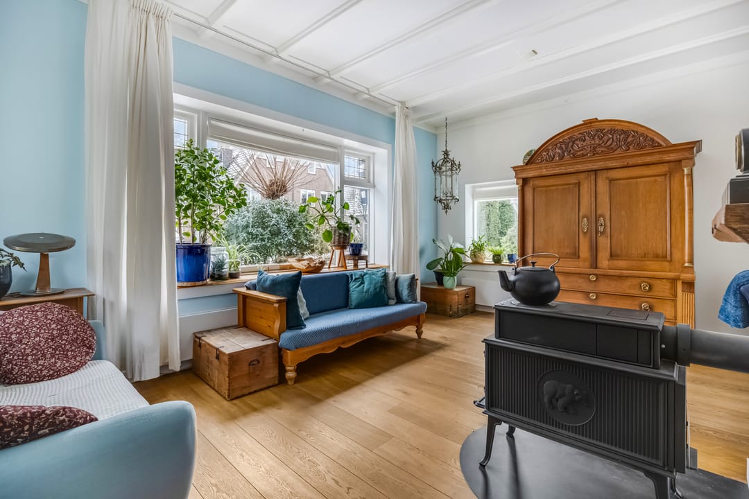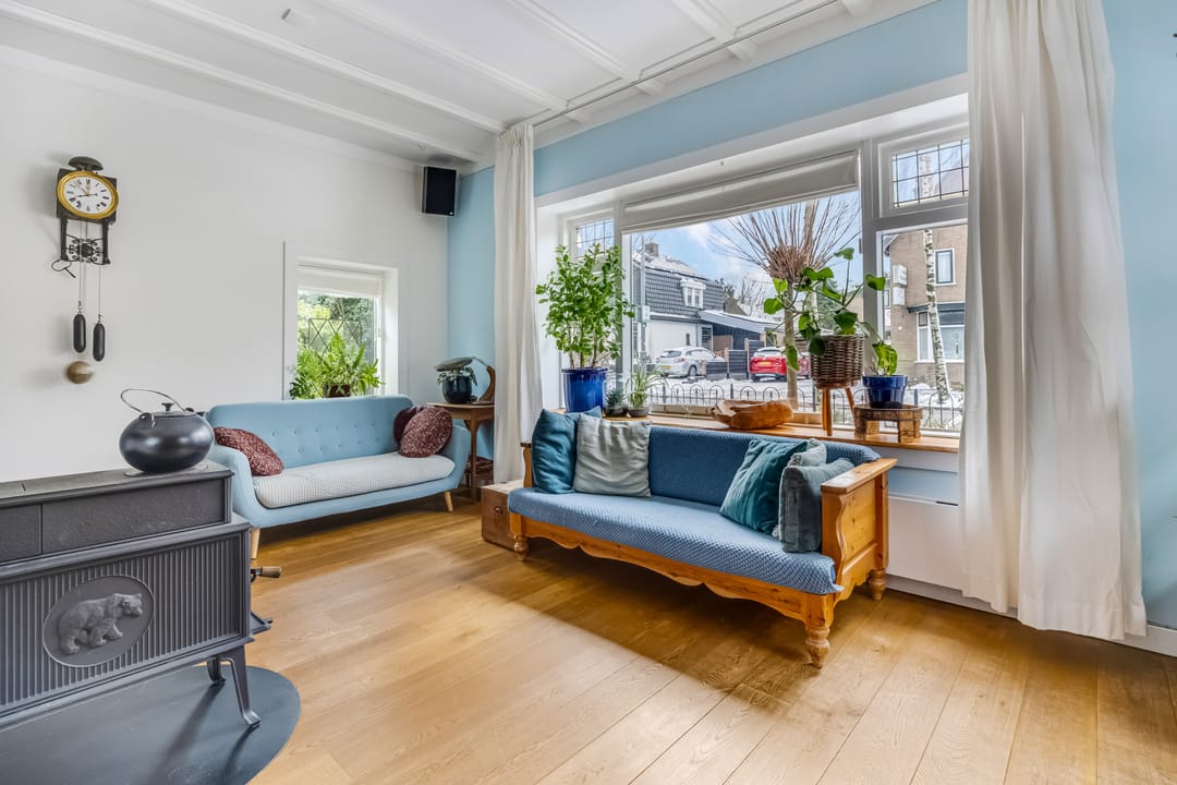 Aan de voorzijde bevindt zich de L-vormige woonkamer, met een houten vloer en de aansluiting voor een houtkachel. Er zijn meerdere glas-in loodramen behouden, net als de schouw, en ook hier zie je een balkenplafond. Het hoge plafond en de grote ramen maken de woonkamer heel ruimtelijk en licht. Achter een van de deuren is de trap naar een wijn-/provisiekelder.