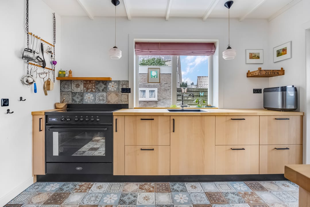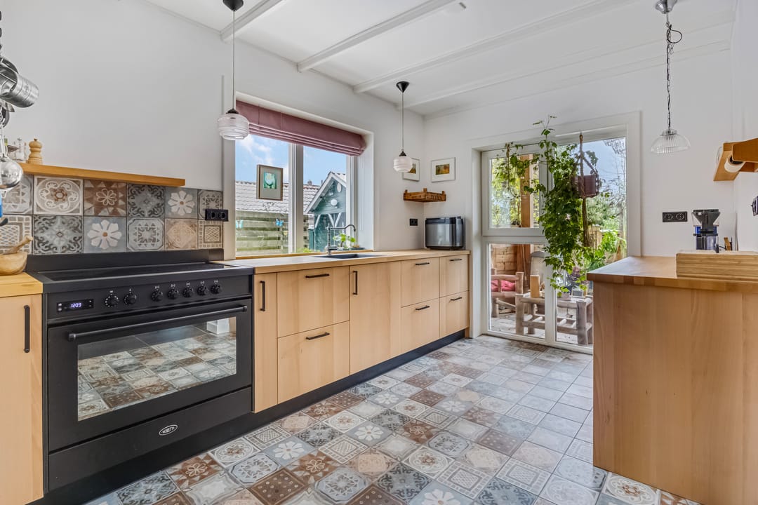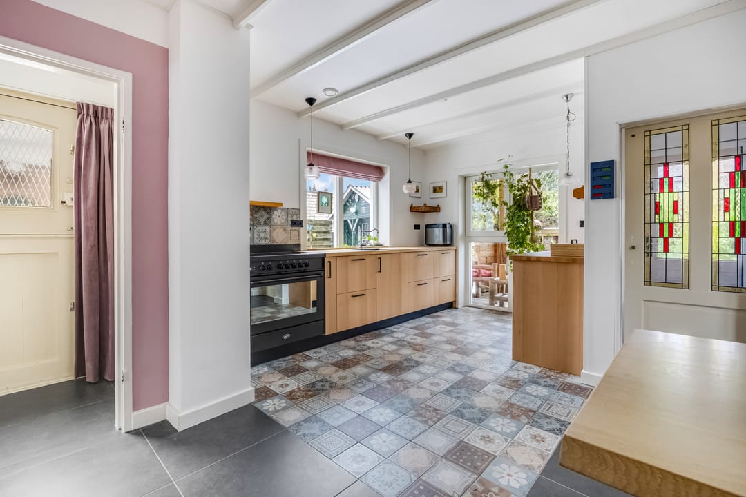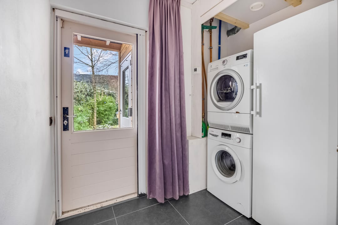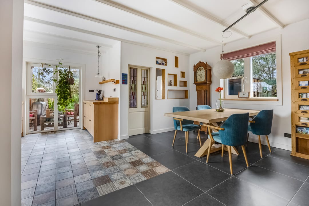 Een groot deel van het dagelijks leven vindt plaats in de woonkeuken, met lichtinval vanaf drie zijden en een deur naar het overdekte terras aan de achterzijde. Onder de stijlvolle tegelvloer ligt vloerverwarming en het balkenplafond is, dankzij de lichte kleur, subtiel aanwezig. De houtlook keukenopstelling (2024) met zwarte accenten is voorzien van diverse inbouwapparatuur, waaronder een Boretti inductie fornuis met oven. In de bijkeuken is ruimte voor een koelkast, vriezer, wasmachine en droger.