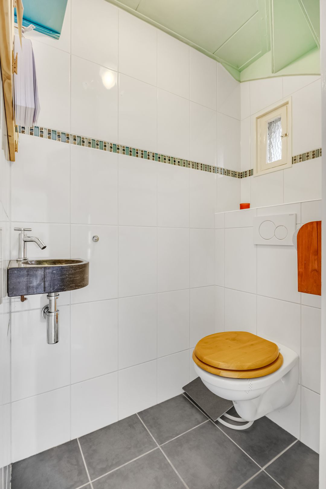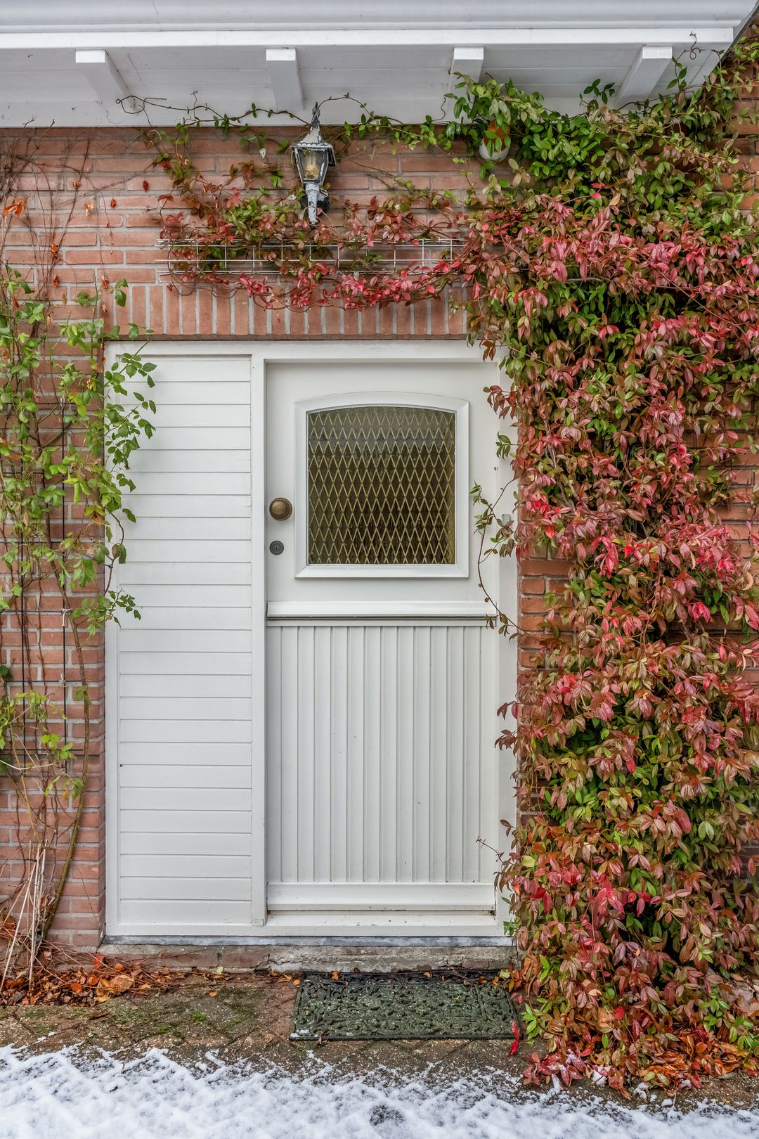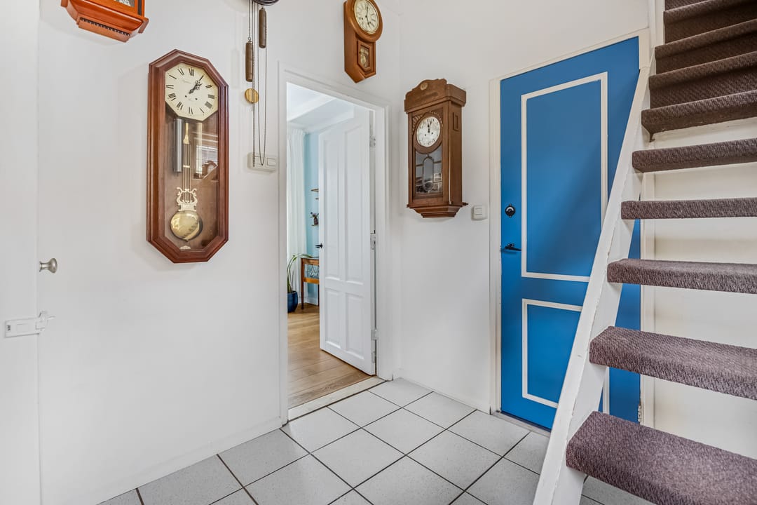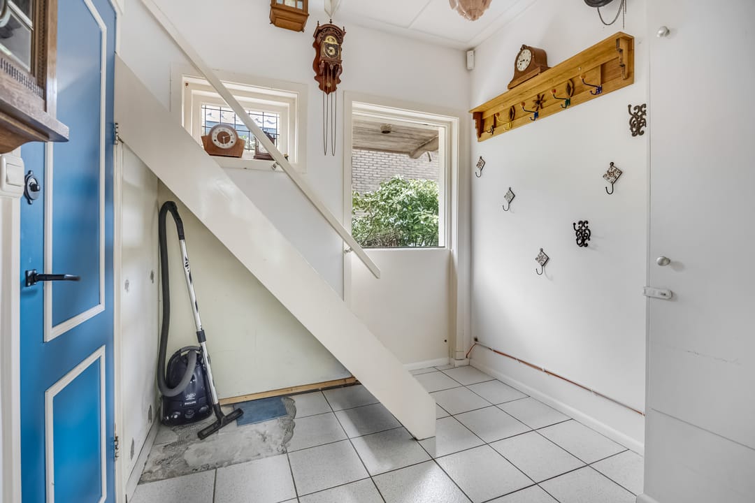 De officiële entree van de woning bevindt zich aan de rechterzijde, maar deze is momenteel niet in gebruik. Achter de voordeur vind je de lichte hal met de meterkast, de trapopgang en de toiletruimte. Een van de paneeldeuren is nog origineel, net als het glas-in loodraam bij de trap. Er is een tweede entree aan de linkerzijde, bij de inrit naar het bijgebouw. Rondom de deur zie je mooie beplanting, in deze tijd van het jaar in prachtig groen en rood. Achter deze deur is een tweede hal, die in verbinding met de woonkeuken staat.