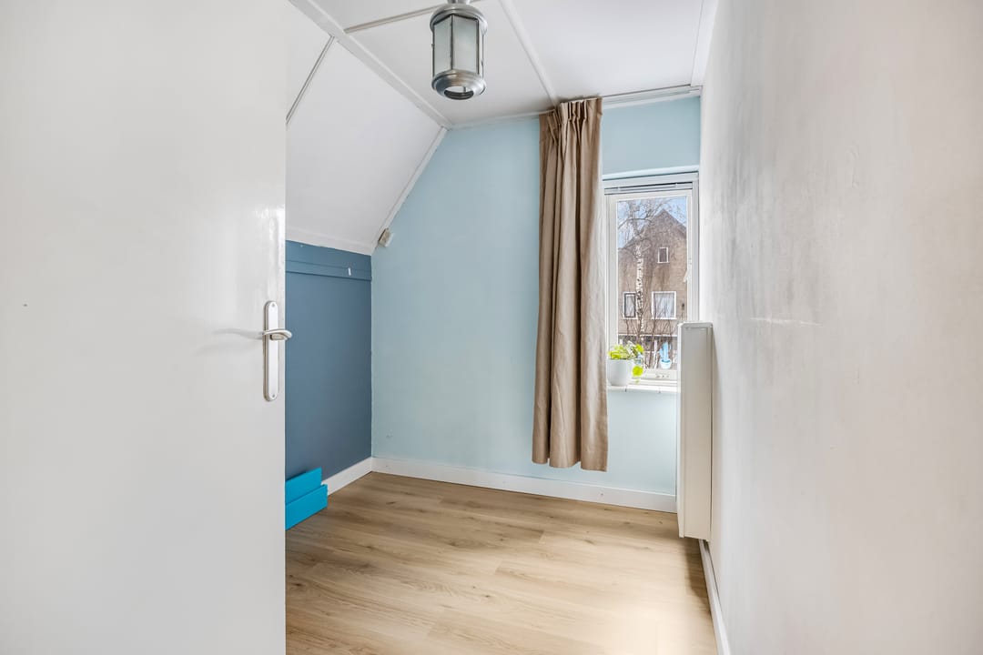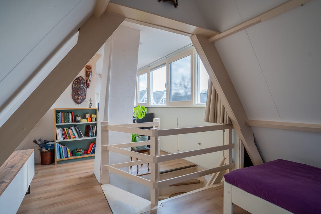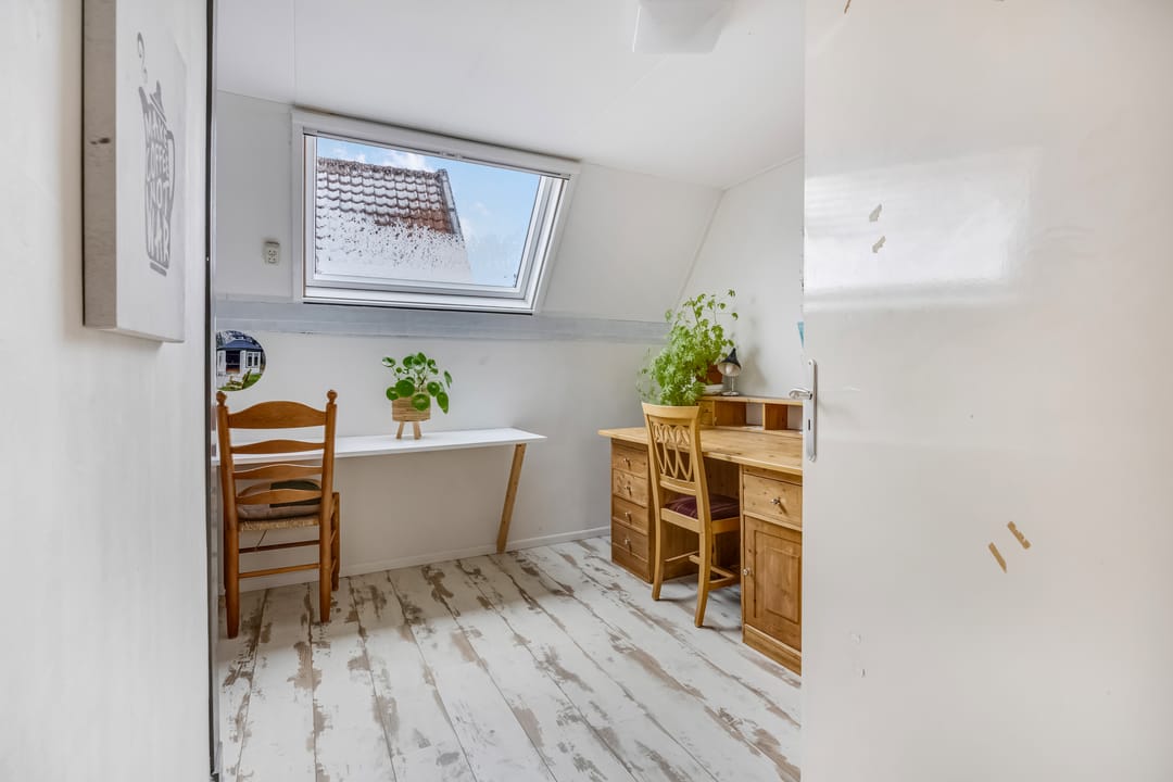 Er is een vaste trap naar de tweede verdieping, waar een grote ruimte klaar is voor een nieuwe invulling. Een lange dakkapel zorgt voor veel extra ruimte, waardoor de ruimte onder andere geschikt is als slaapkamer.