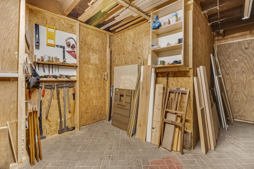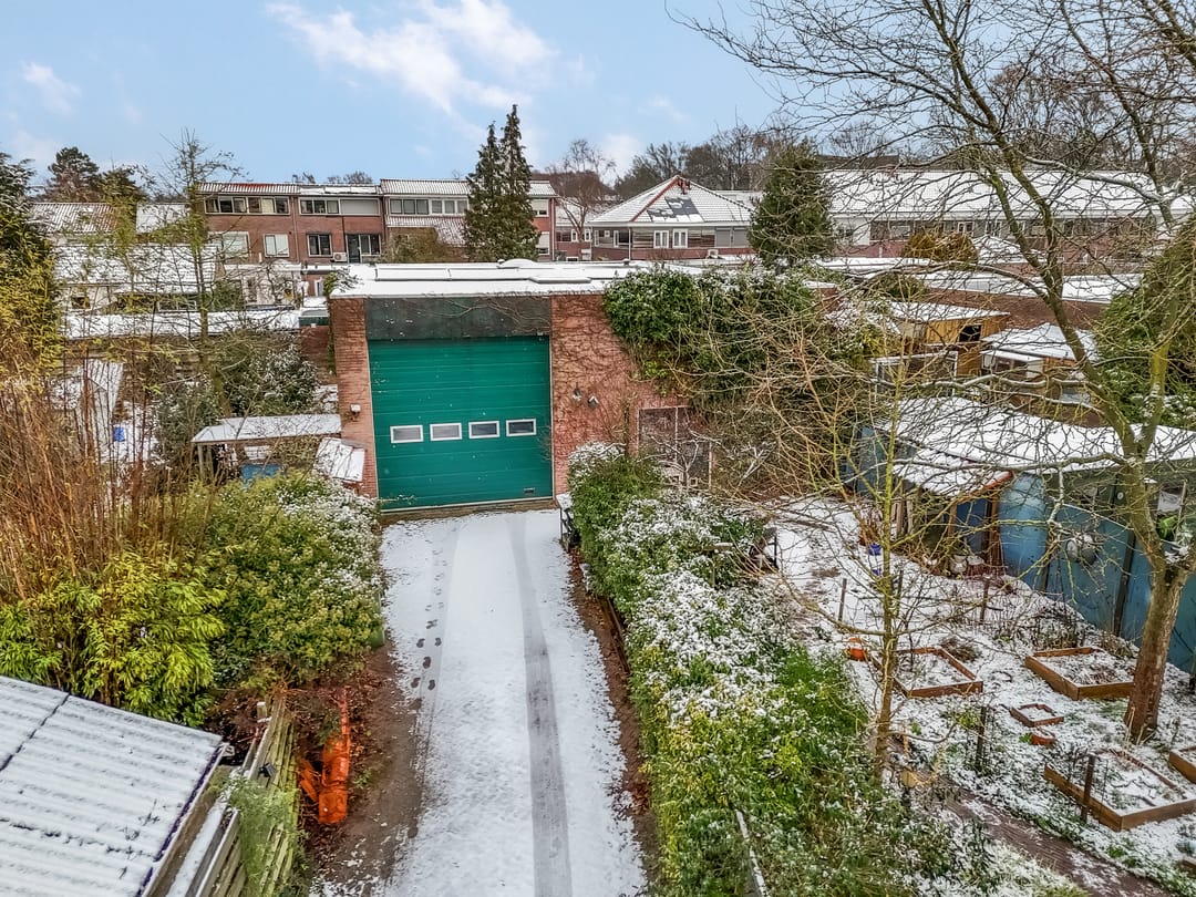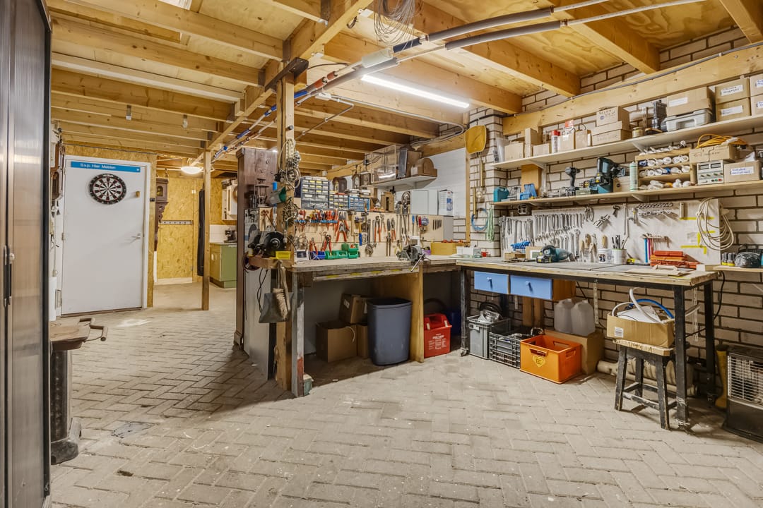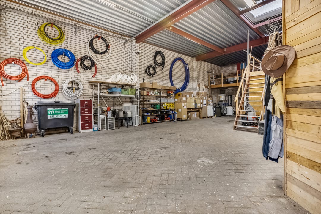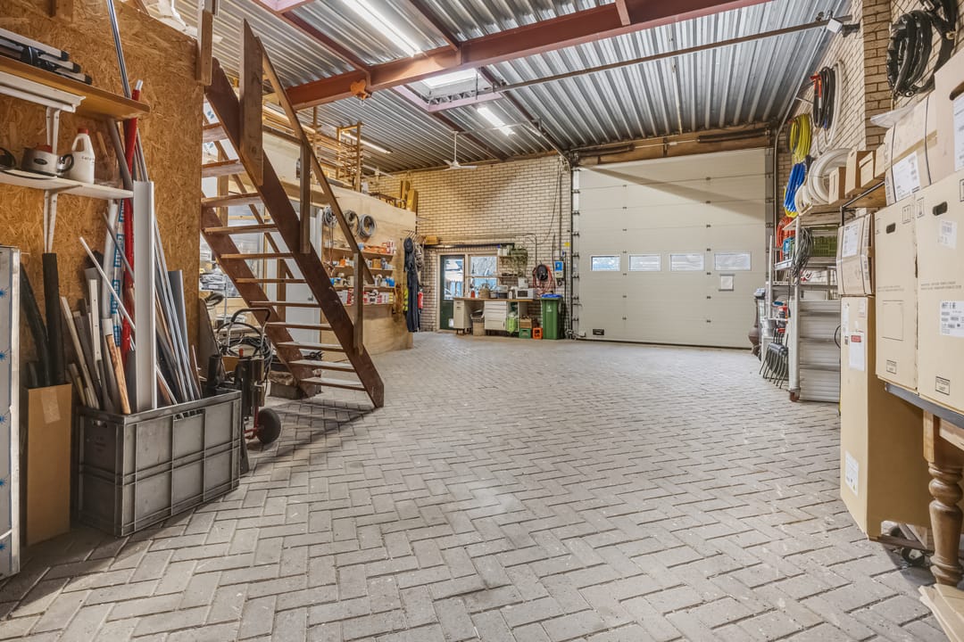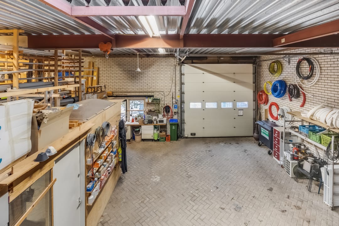 Met een oppervlakte van circa 165 m2 biedt het bijgebouw volop ruimte voor een ondernemer of hobbyist. Een grote, groene roldeur zorgt dat je zo met een auto, caravan, camper en een kleine vrachtwagen naar binnen kan rijden. Er zijn werkruimtes, bergingen, een toilet en een grote loods met lichtstraat. Let ook op de royale hoogte en de tussenvloer, wat het bijgebouw heel aantrekkelijk maakt.