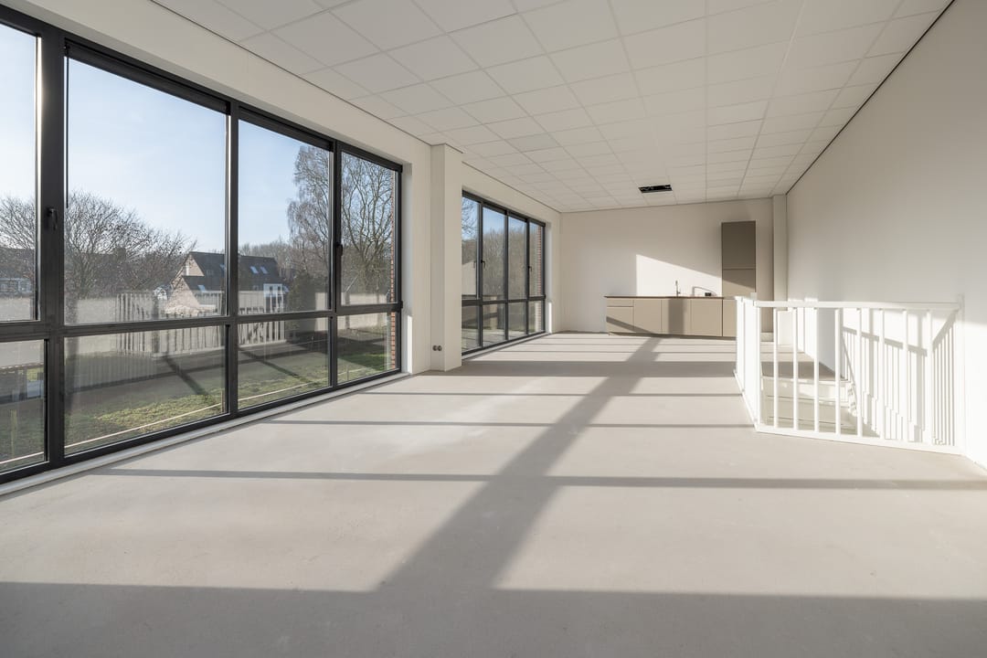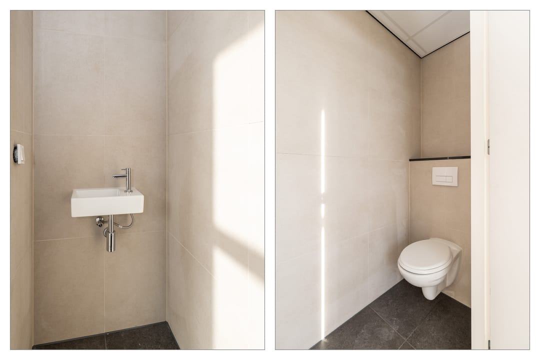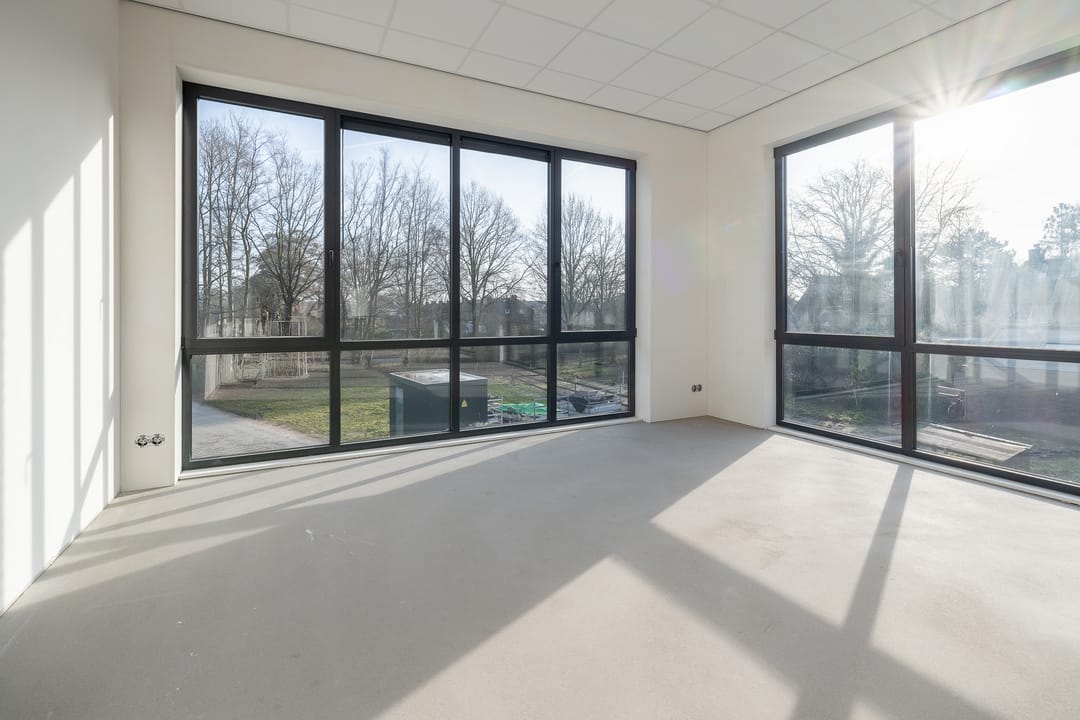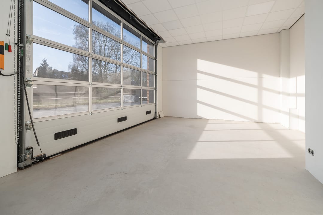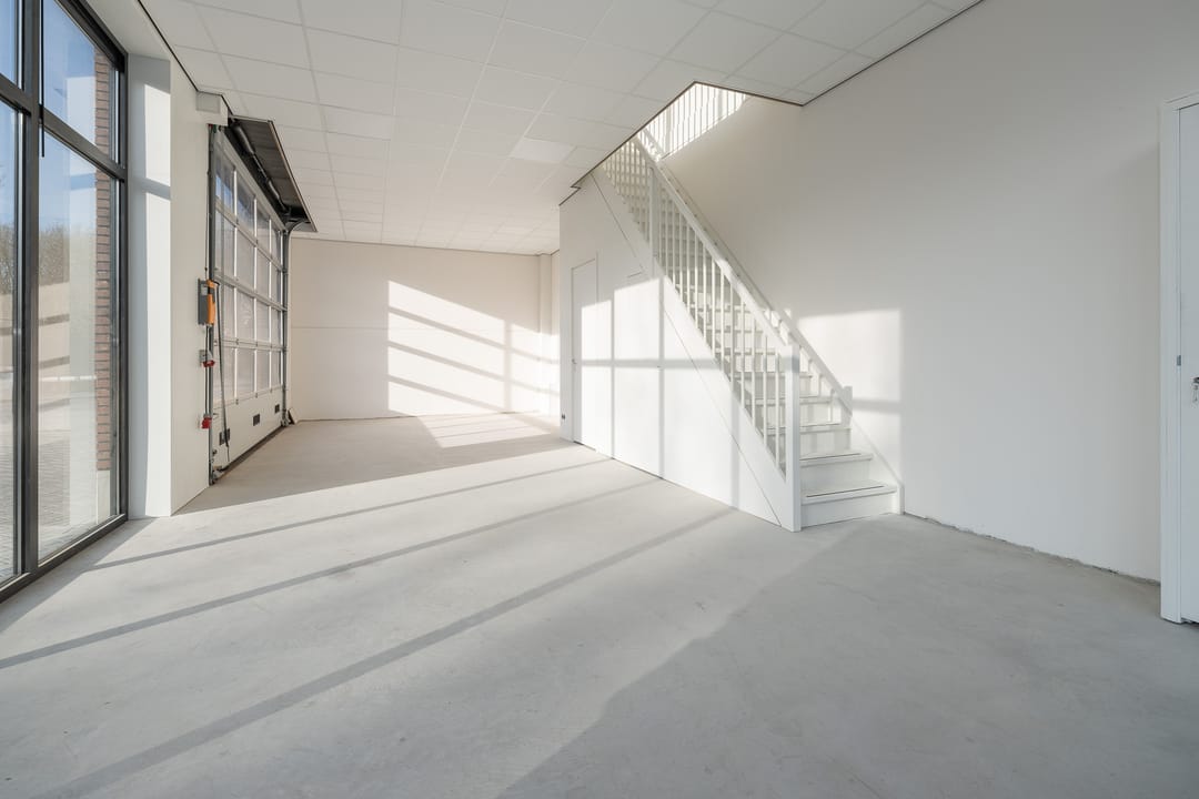 De begane grond heeft een verhuurbaar vloeroppervlak van circa 58 m² en is voorzien van strak gestuukte wanden en een systeemplafond. Aan de linkerzijde bevindt zich een elektrische overheaddeur. Het toilet is gesitueerd onder de trap en is volledig afgewerkt. De vloer dient door huurder nog naar eigen wens te worden aangebracht. Via de trap is de kantoorruimte op de eerste verdieping bereikbaar. Deze verdieping heeft een verhuurbaar vloeroppervlak van circa 60 m² en kenmerkt zich door veel daglicht, wat zorgt voor een aangename werksfeer. Ook hier zijn de wanden gestuukt en is een systeemplafond aanwezig. Daarnaast beschikt deze verdieping over een pantry met inbouwapparatuur.