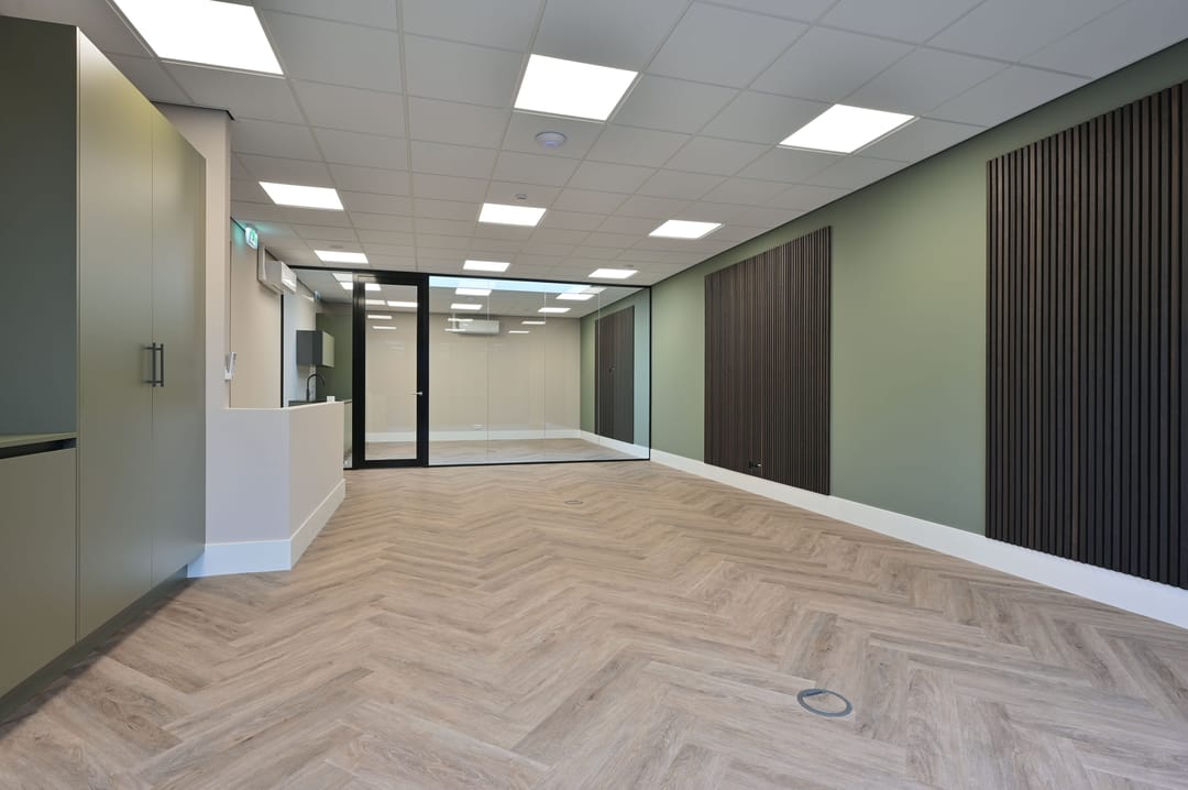 - Vloer voorzien van plinten en PVC-visgraat.
