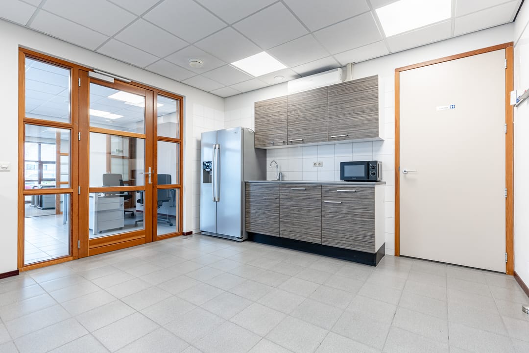 • Kantine aangrenzend aan de bedrijfsruimte met een extra toiletruimte en pantry inclusief koelkast, wasbak met kraan, magnetron, vaatwasser en boiler;