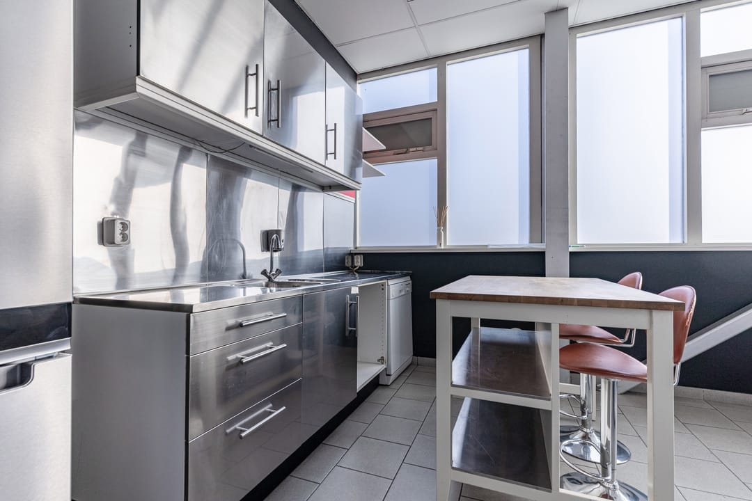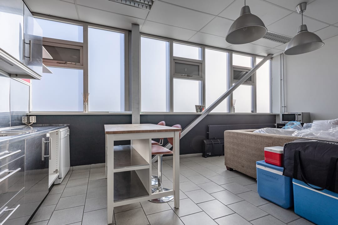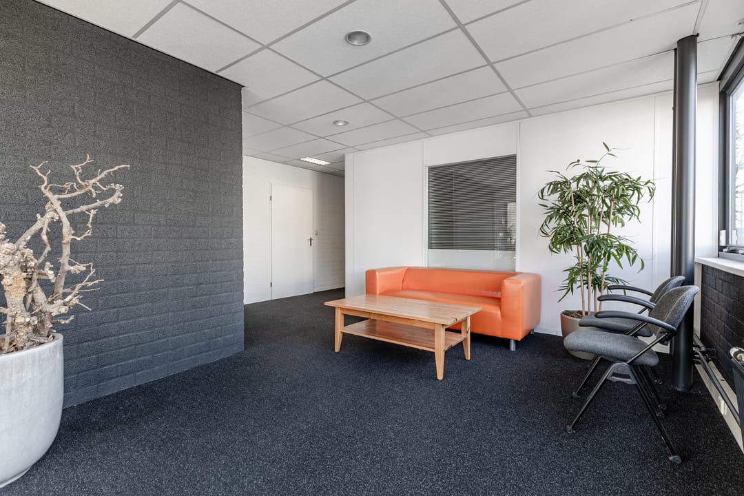 - inbouwkantoor met systeemplafond, TL-verlichting, tegelvloer, radiator en pantry