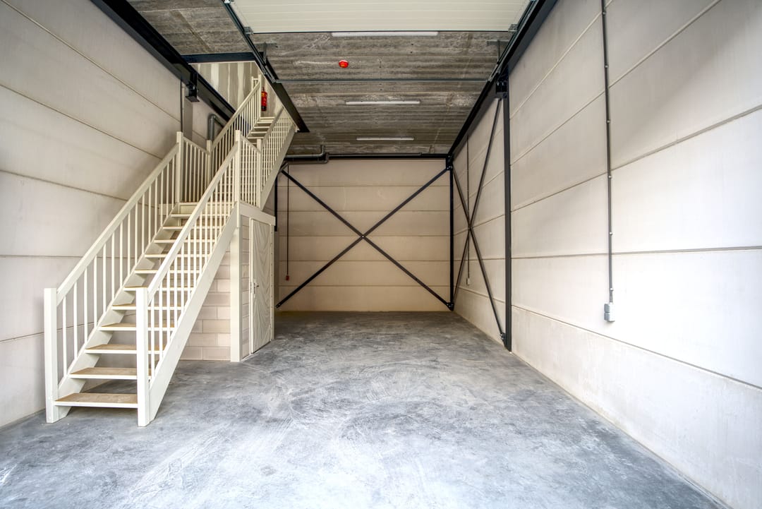 - Overheaddeuren, betonvloer, toilet, pantry, mechanische ventilatie, inbouwarmaturen en te openen ramen