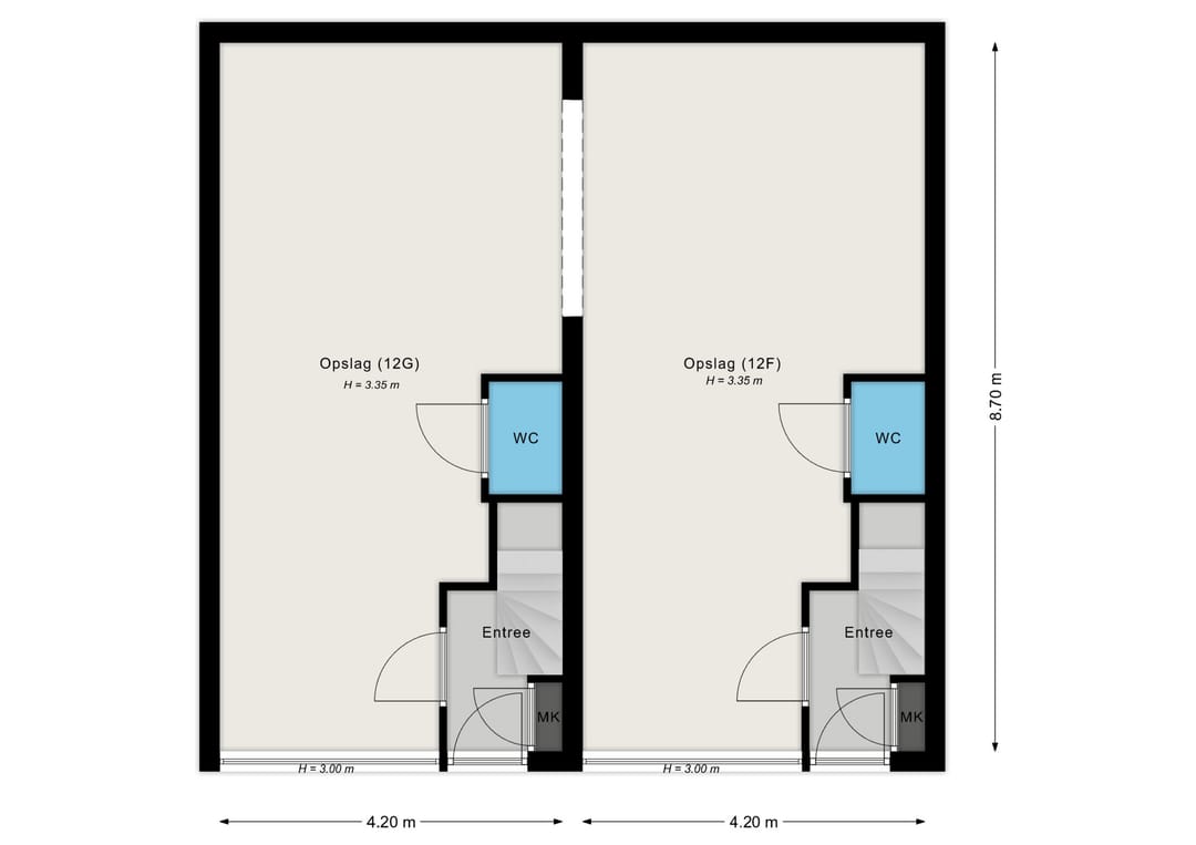 De units beschikken ieders op de begane grond over een eigen entree met meterkast voorzien van aansluitingen voor gas, elektra, water en telefoon / internet. Via een vaste trap is de verdieping te bereiken. Via een tussendeur is de werkplaats / bedrijfsruimte te bereiken. Deze is voorzien van een keurig toilet v.v. wandcloset en fonteintje.