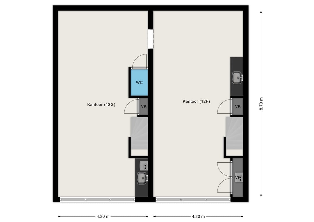 De units beschikken ieders over een verdieping van circa 36.50 m², ieders met een HR C.V.-ketel en radiatorenverwarming en airconditioning. De ruimte is vrij indeelbaar en heeft een grote raampartij met vrij uitzicht. De raampartij is voorzien van draai-/kiepramen (natuurlijke ventilatie).
