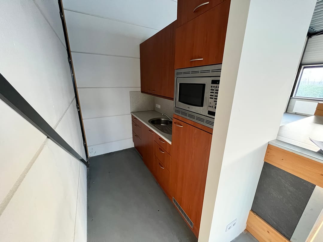 -royale en nader in de delen open ruimte met veel lichtinval, balie en afgescheiden ruimte voorzien van een functionele keukeninrichting met spoelbak, voldoende kastruimte, inbouw koelkast en combimagnetron.