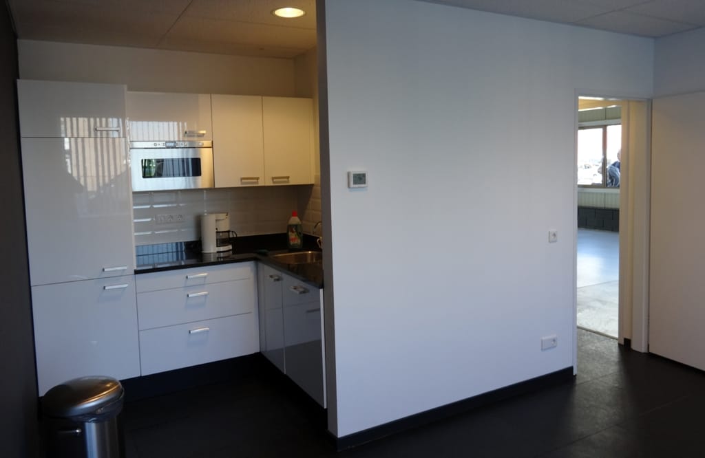 Keuken/kantine: Energiezuinige verlichting met sensoren, systeemplafond, hoogglans keuken met inbouw apparatuur; koelkast, vriezer, vaatwasser en magnetron, akoestisch gedempte vloertegels (antraciet), verwarming via CV radiatoren.
