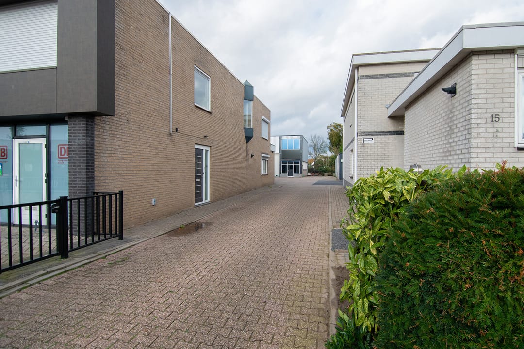 entree, ruime hal met meterkast, kantoorruimte, kantine, pantry en toilet (samen ca. 40m²) en ruime bedrijfsruimte/-hal van ca. 210m² met overheaddeur, krachtstroom, verlichting en via vaste trap is het goed beloopbare entresol bereikbaar van ca. 40m².