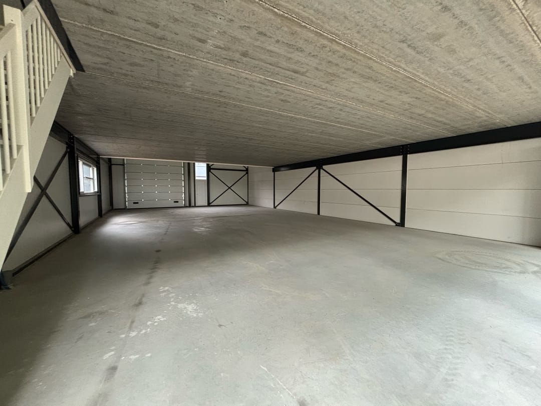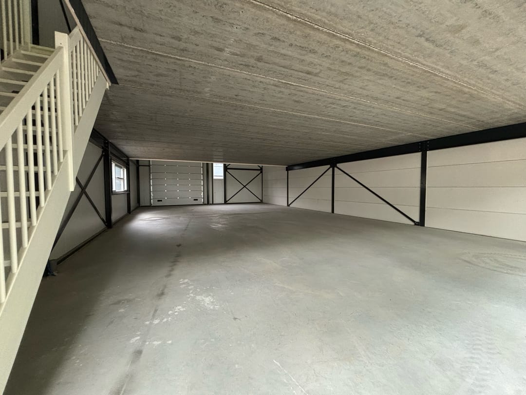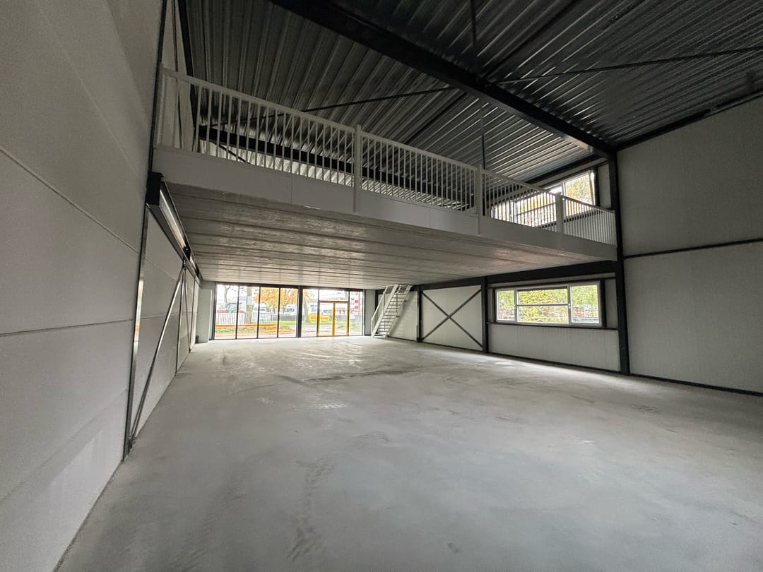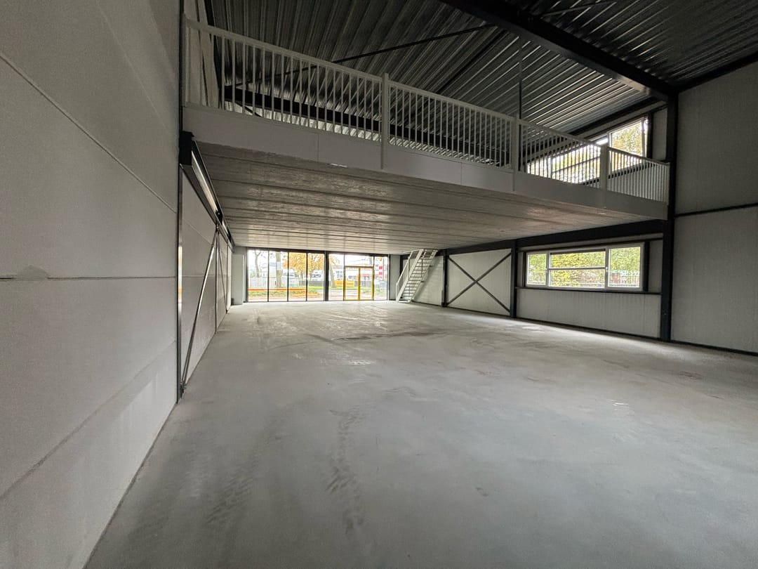 Binnen beschikt de bedrijfsruimte over een lichte, open indeling met een vrije hoogte en een betonnen verdiepingsvloer van circa 165 m². De vloer biedt ruimte voor kantoorinrichting of extra opslag. De unit is voorzien van drie afvoeraansluitingen — twee in de achterhoeken en één onder de trap — wat flexibiliteit biedt bij de inrichting van sanitaire voorzieningen of pantry.