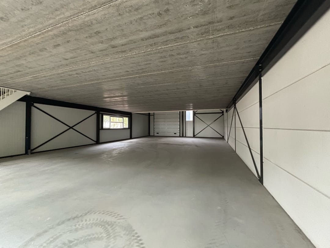 Aan de voorzijde bevindt zich een volledige glazen pui met twee openslaande deuren, ideaal voor gebruik als showroom of representatieve entree. De achterzijde is voorzien van een overheaddeur met naastgelegen loopdeur, wat de ruimte praktisch maakt voor opslag, werkplaats of logistieke doeleinden.