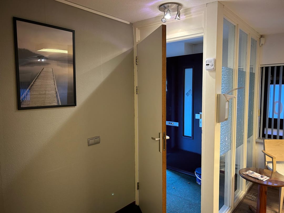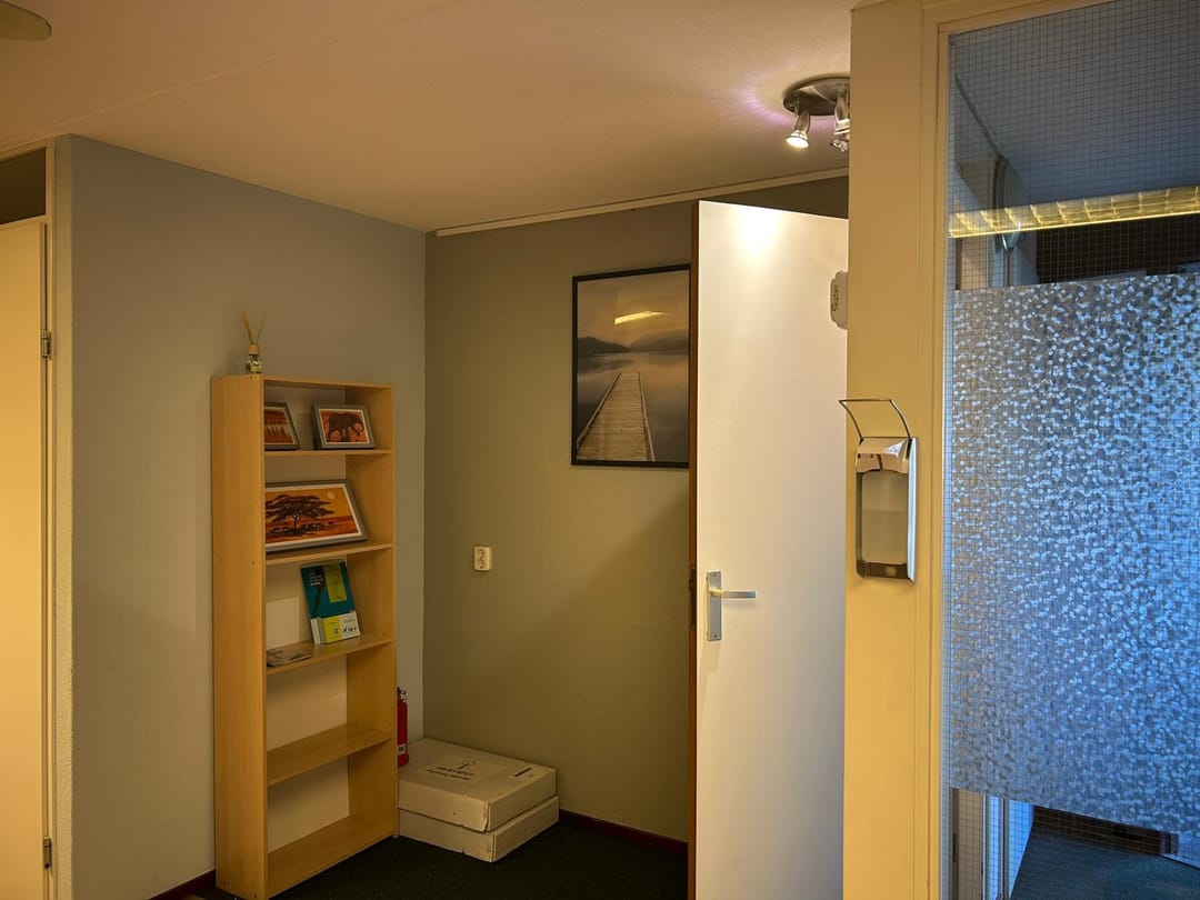 De ruimte is opgesplitst in een entree, een open ruimte en een afgesloten ruimte (t.b.v. vergaderruimte en/of privacy, voorheen behandelruimte).