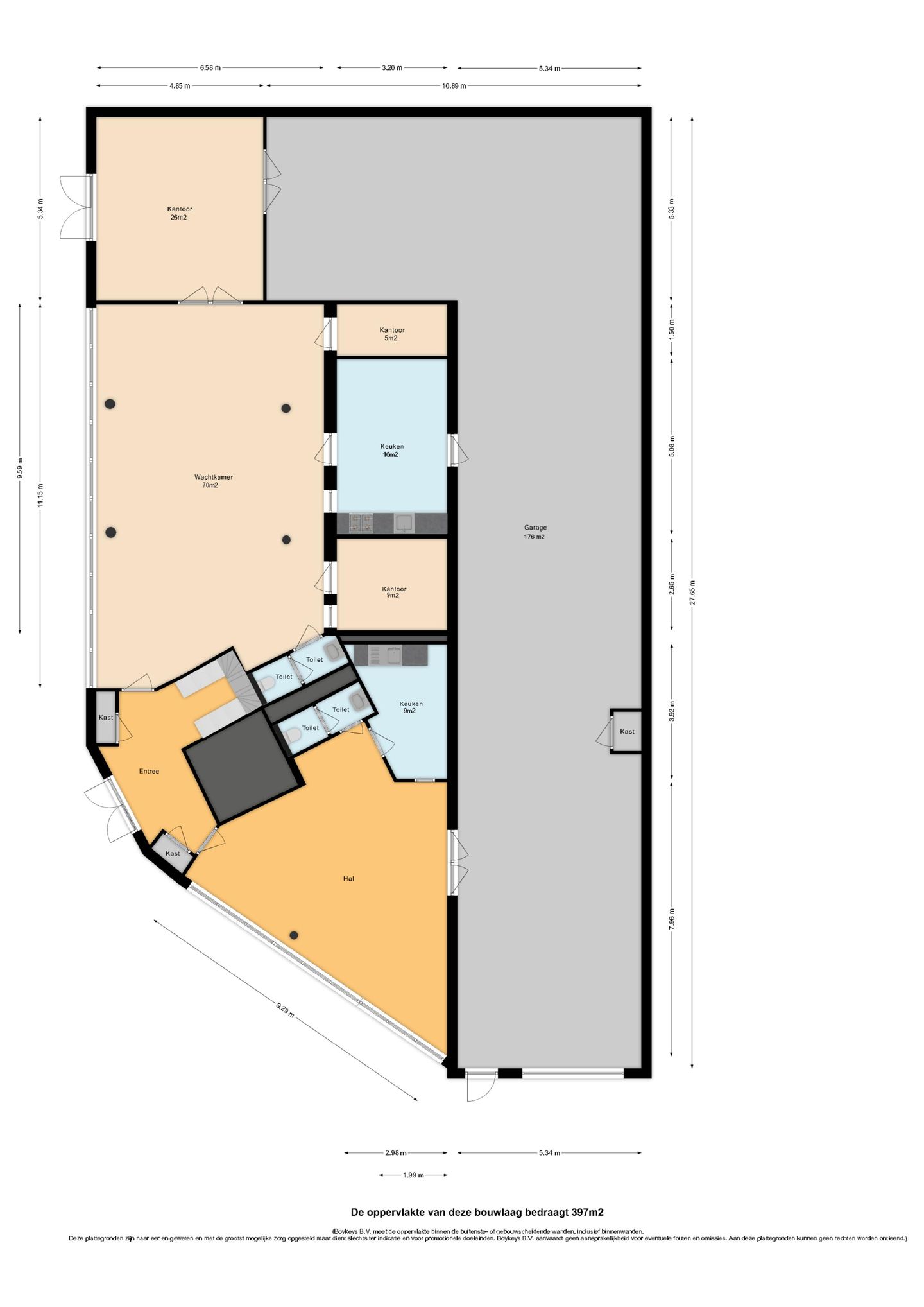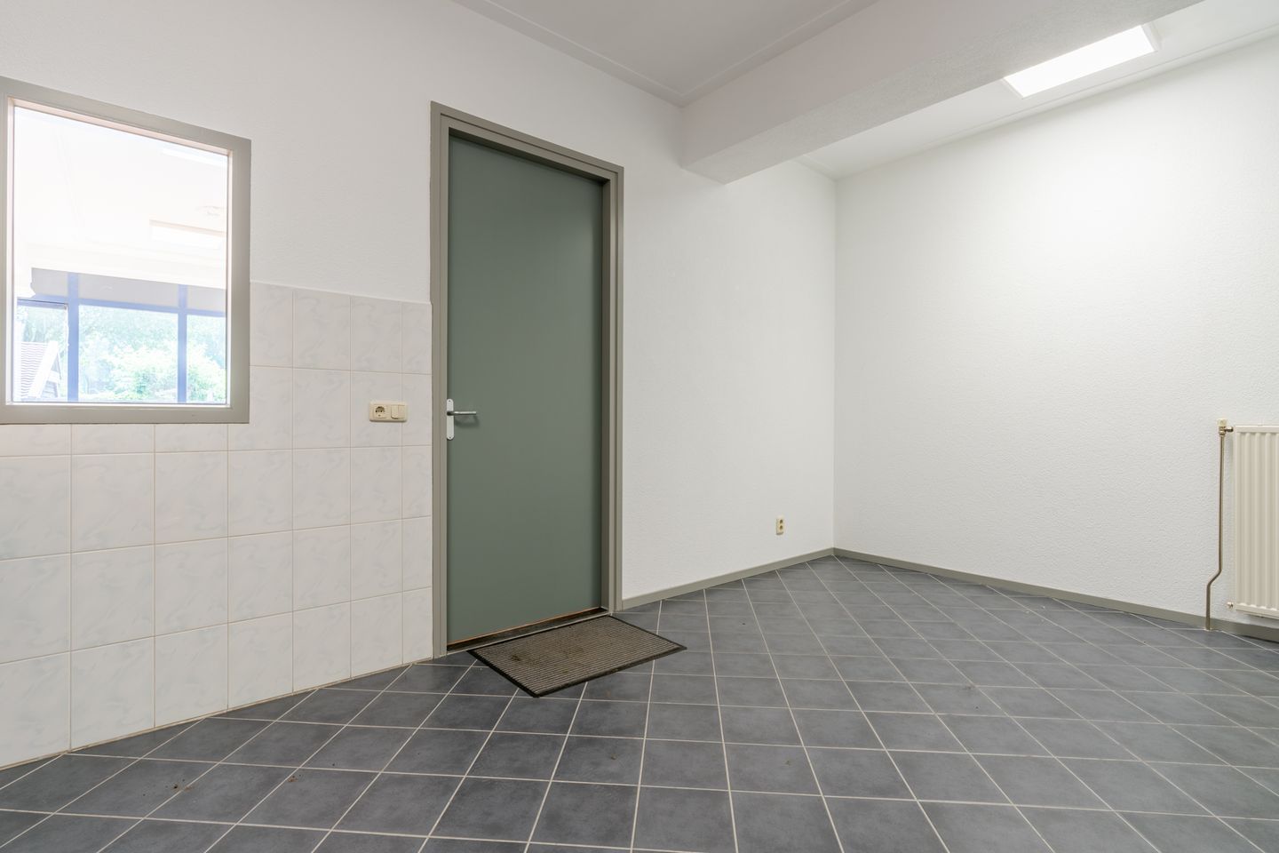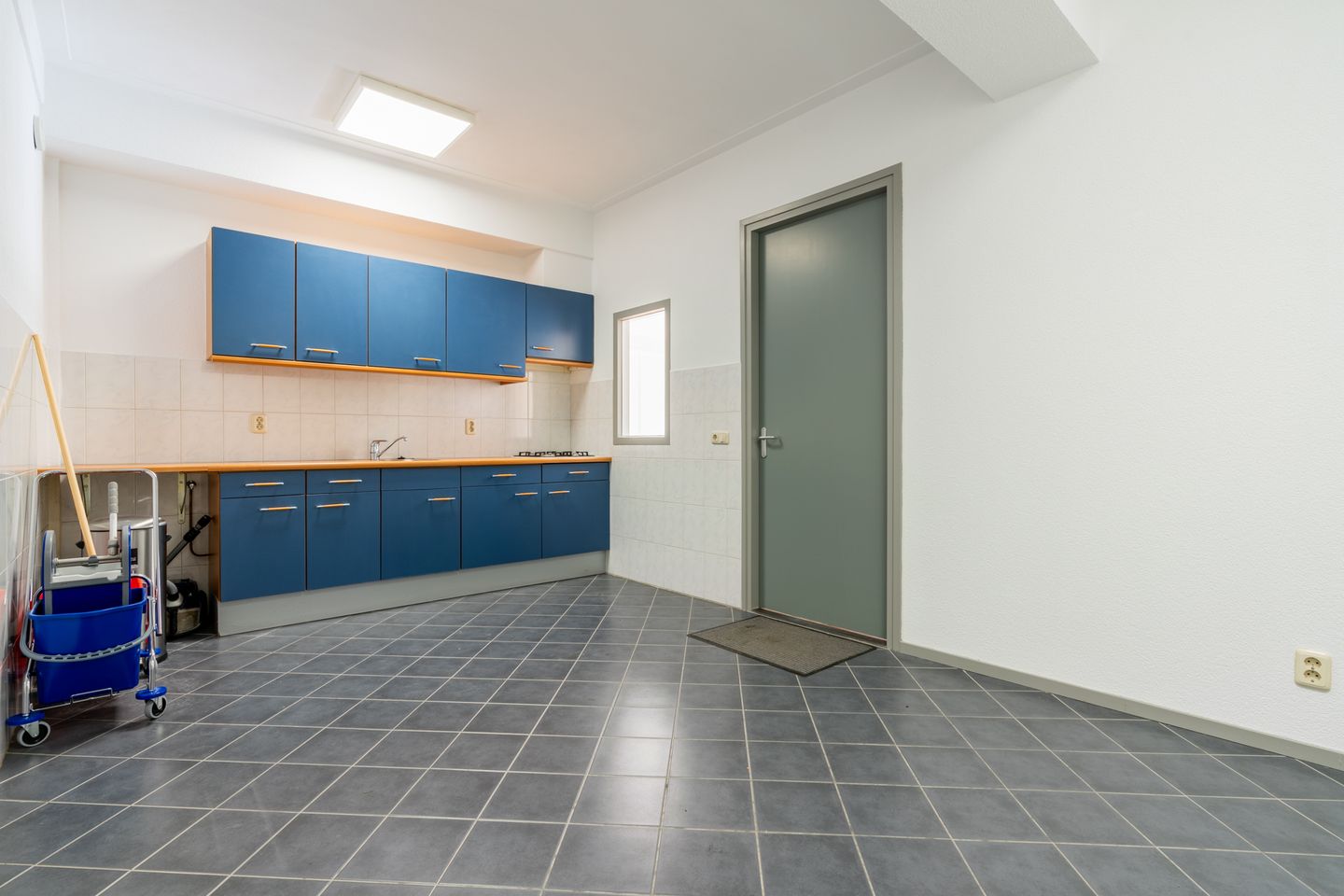 Gezamenlijke entree met meterkast. Royale en keurige afgewerkte kantoorruimte/showroom van 70m². Deze kantoorruimte/showroom beschikt over een eigen kantine met pantry, toilet en drie (kantoor)ruimtes van respectievelijk 25, 9 en 5m². Ruime kantoorruimte aan de voorzijde met toilet en kantine met pantry. Grote bedrijfshal van 176m² voorzien van overheaddeur en loopdeur.