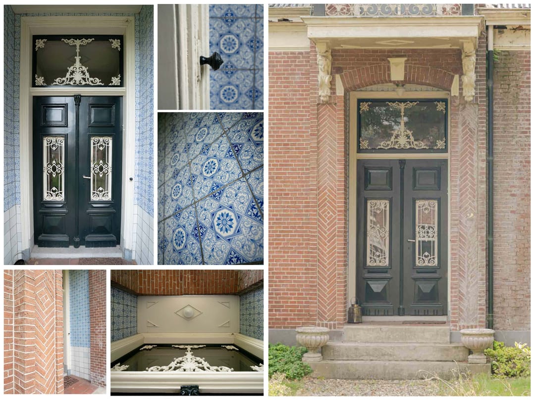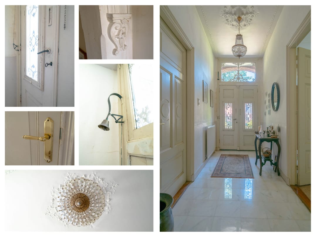 Gang: De sierlijke entree geeft toegang tot het voorhuis van de boerderij. In de hal zijn tal van historische kenmerken te vinden als dubbel openslaande deuren met sierlijk gietijzer elementen, trekbel, marmeren vloer en een plafond met sierlijsten en een rozet met kroonluchter.