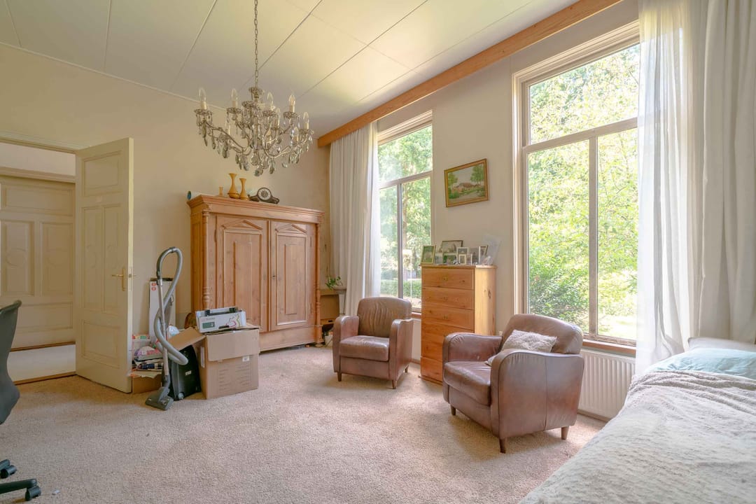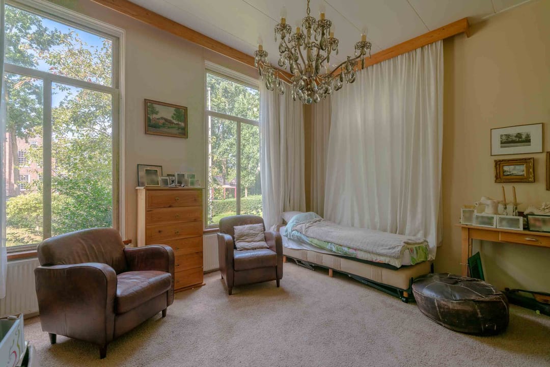 Slaapkamer: Aan de andere zijde van de hal, ook aan de voorzijde van de woning, is een ruimte van circa 24m2 welke nu is ingericht als slaapkamer. Evenals de woonkamer doet deze ruimte licht aan met haar hoge ramen. Er is een inbouwkast aanwezig.