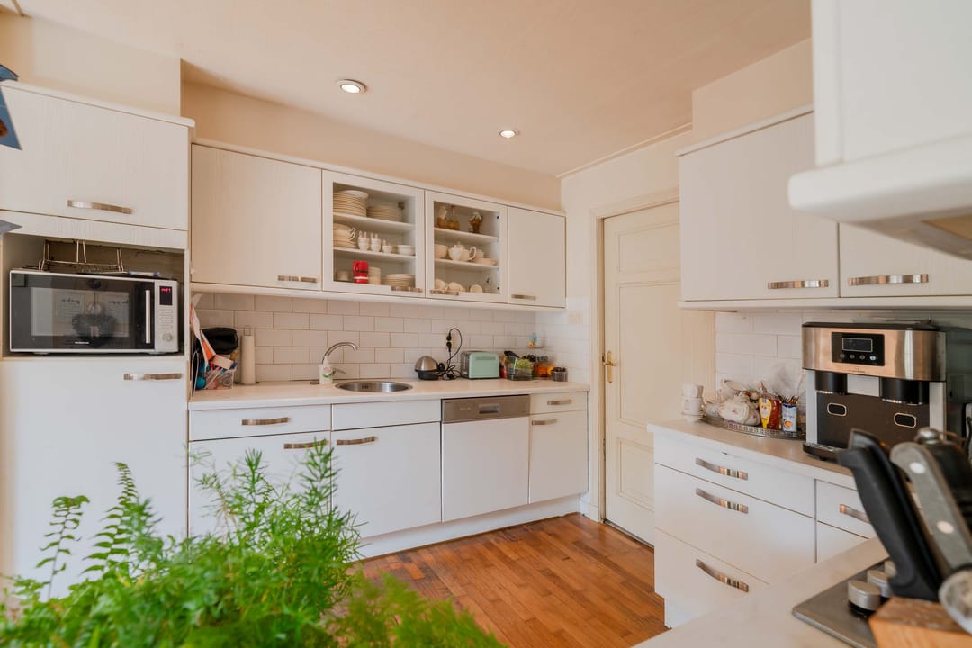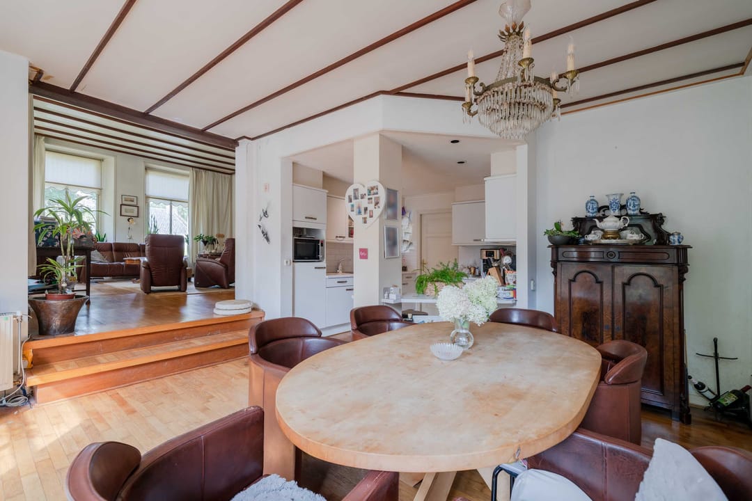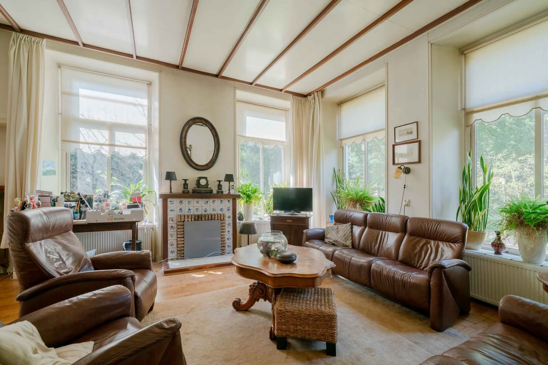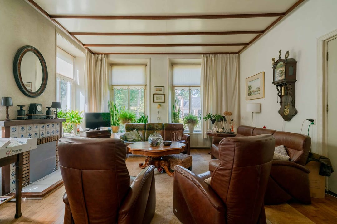Woonkamer: De woonkamer aan de voorzijde doet licht aan door de 4-tal hoge ramen. Er is een oude schouw aanwezig zonder kachel. De ondervloer is van hout en bedekt met houtenvloer. De ruimte wordt verwarmd middels radiatoren.