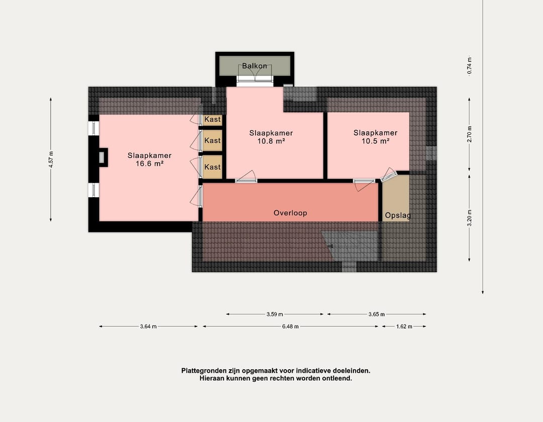 Slaapkamers: Er zijn drie slaapkamers op de verdieping. De grootste slaapkamers is circa 16m2 groot en heeft enkele inbouwkasten, de overige twee kamers zijn circa 10m2 groot.