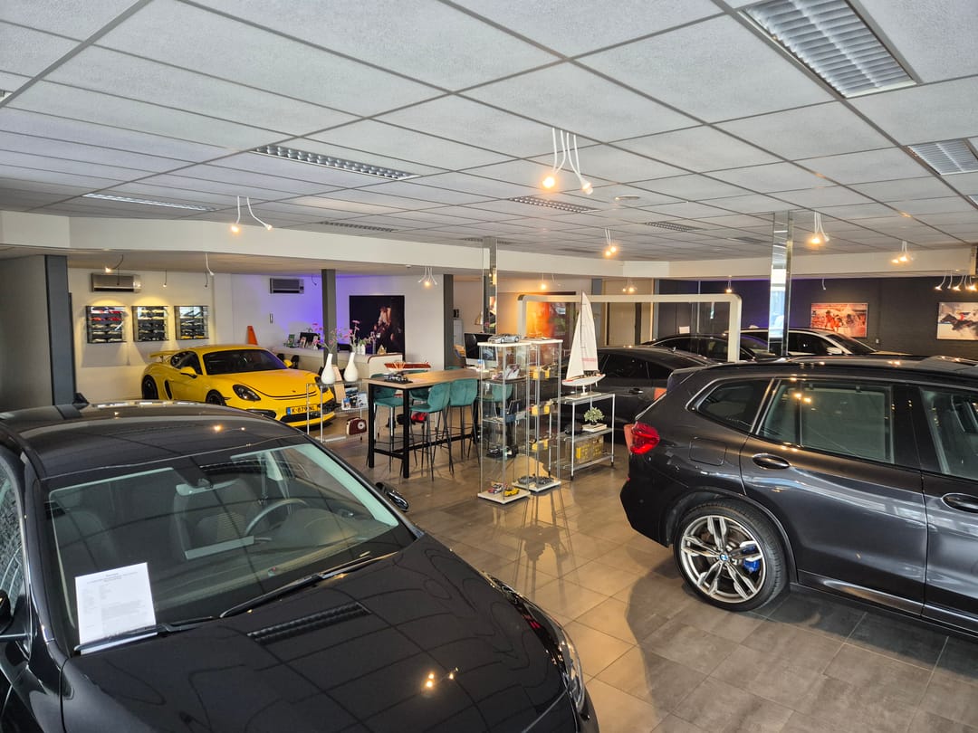 Royale showroom met entree en roldeur voor voertuigtoegang, voorzien van receptie/ontvangstruimte, toilet en facilitaire ruimte, geschikt voor ondersteunende bedrijfsactiviteiten.