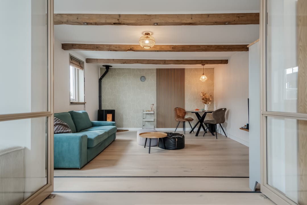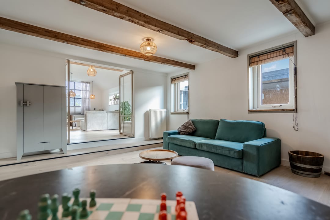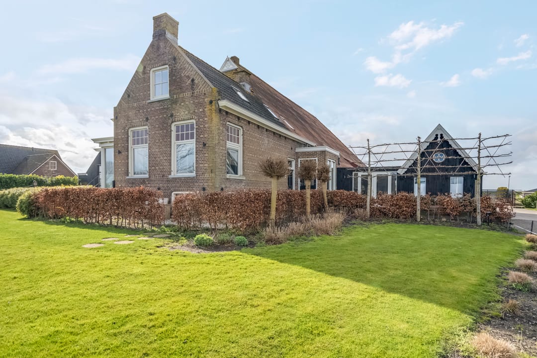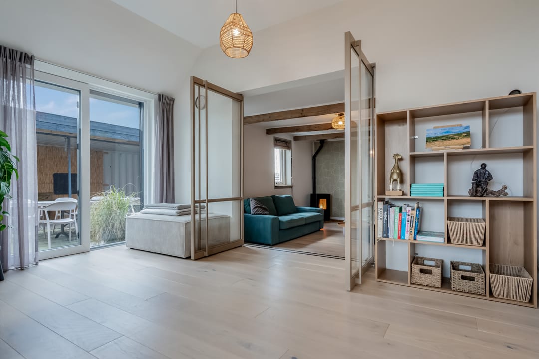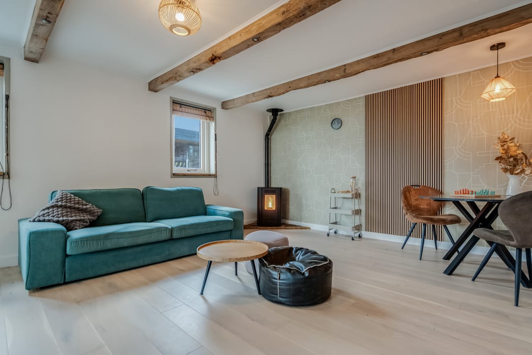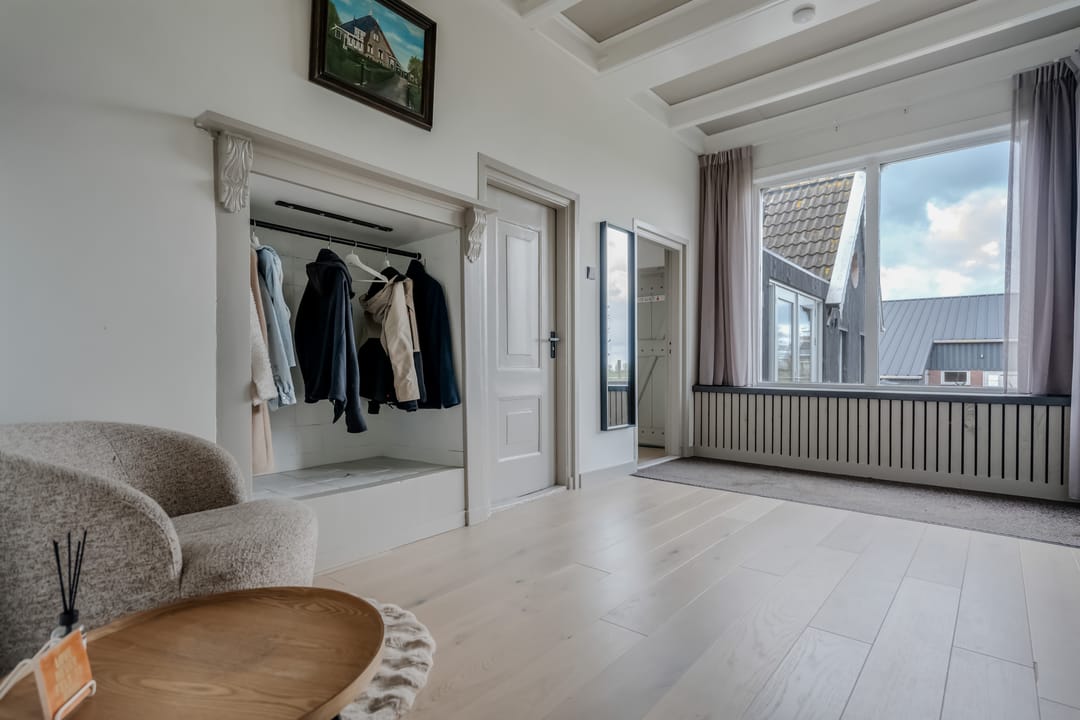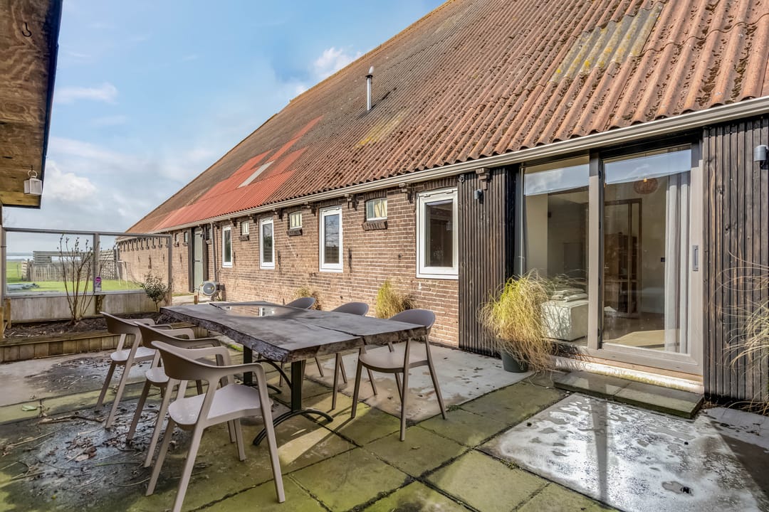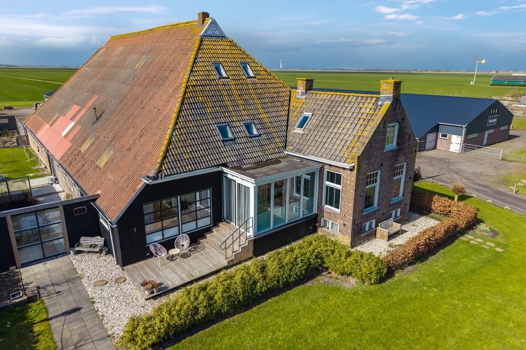 Begane grond: entree, royale hal met garderobe en authentieke details. Vanuit de hal bereikt u een modern toilet en een separate badkamer, voorzien van een ligbad met regendouche en handdouche, alsmede een wastafel met stijlvol meubel waarin de wasmachine en droger subtiel zijn geïntegreerd. De recent zeer smaakvol gemoderniseerde woonkeuken is gesitueerd in de serre van de boerderij en vormt een prachtige, lichte leefruimte. De keuken is uitgevoerd met een royaal kookeiland en voorzien van diverse inbouwapparatuur, waaronder een inductiekookplaat, oven, vaatwasser en een ruime koelkast. Via de schuifpui is er direct toegang tot de voortuin, waar je in alle rust kunt genieten van het vrije uitzicht over het Friese landschap. De sfeervolle woonkamer aan de voorzijde is licht en ruim dankzij de vele raampartijen en staat in directe verbinding met de keuken. Via stijlvolle taatsdeuren bereik je de achterkamer, ingericht als tweede zithoek met een pelletkachel die zowel de voor- als achterkamer comfortabel kan verwarmen. De doorkijk tussen woonkamer en keuken zorgt voor een moderne, open en lichte uitstraling. Het geheel is verzorgd afgewerkt met gestucte wanden en een rustige, eigentijdse kleurstelling. Aan de zijkant van de boerderij bevindt zich een tweede schuifpui die toegang biedt tot een heerlijk ruim terras, grenzend aan een royaal gras- en speelveld. Daarnaast is er een gedeeltelijk overdekte loungehoek gecreëerd, waar je beschut kunt genieten.