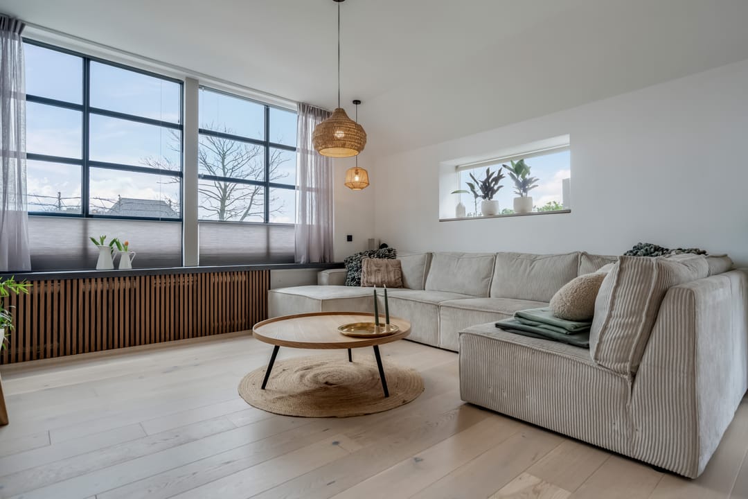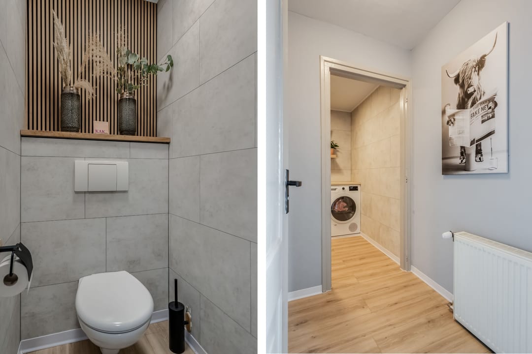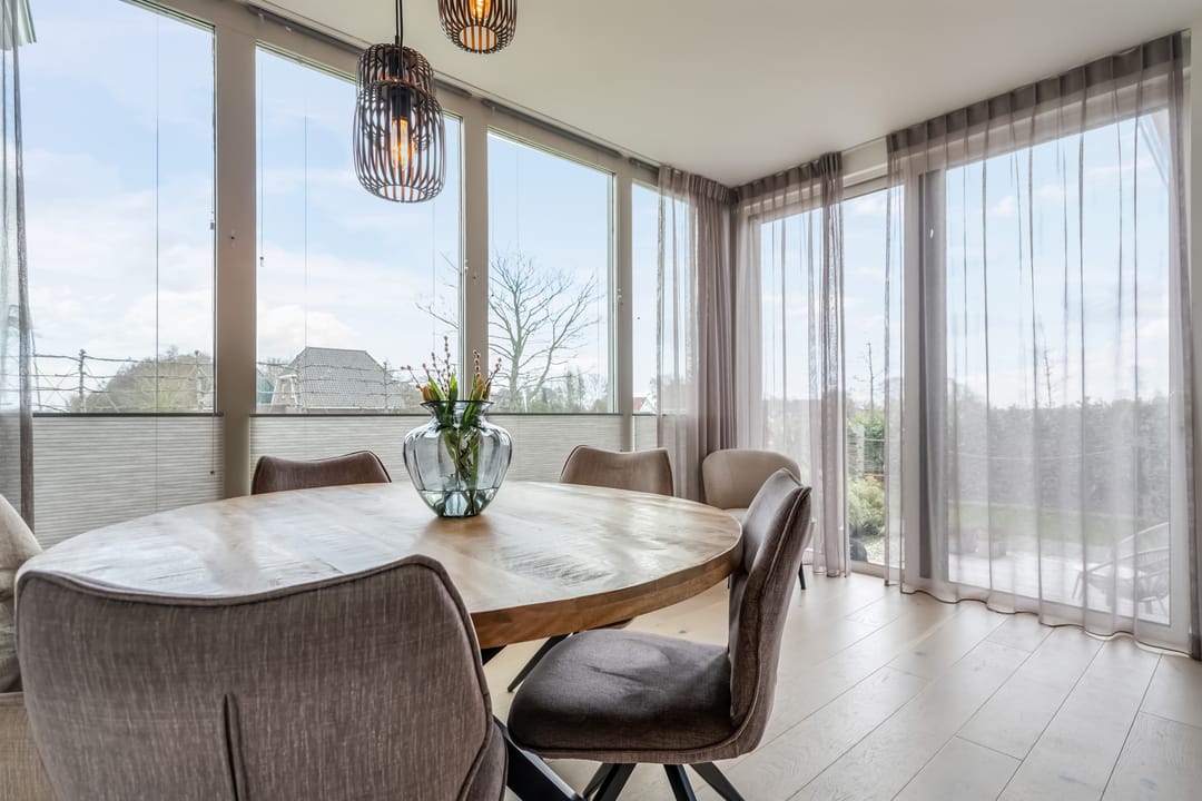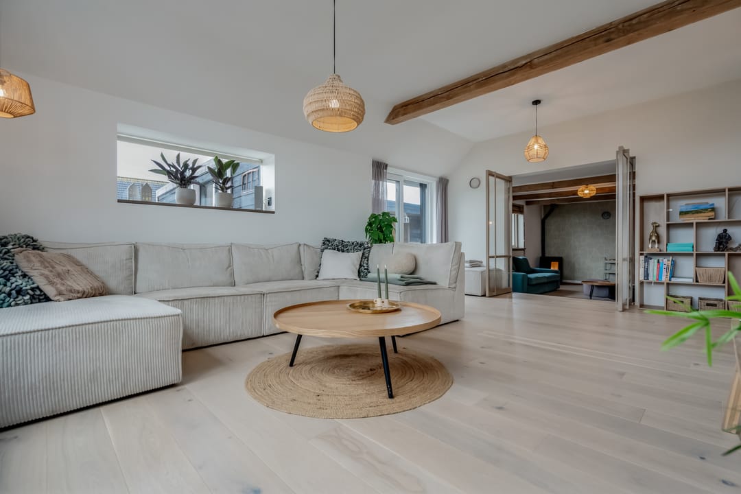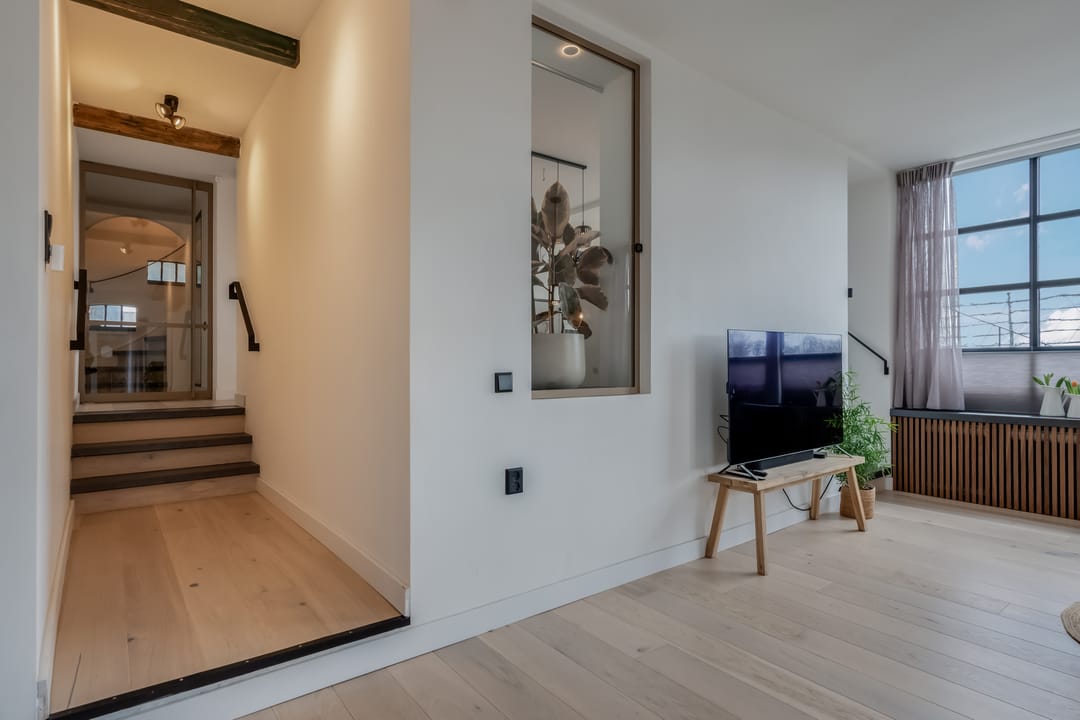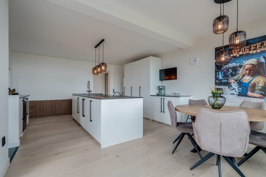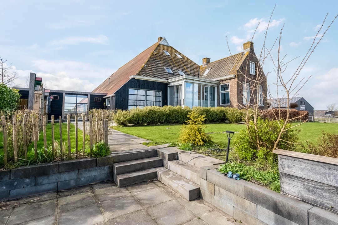 Begane grond: entree, royale hal met garderobe en authentieke details. Vanuit de hal bereikt u een modern toilet en een separate badkamer, voorzien van een ligbad met regendouche en handdouche, alsmede een wastafel met stijlvol meubel waarin de wasmachine en droger subtiel zijn geïntegreerd. De recent zeer smaakvol gemoderniseerde woonkeuken is gesitueerd in de serre van de boerderij en vormt een prachtige, lichte leefruimte. De keuken is uitgevoerd met een royaal kookeiland en voorzien van diverse inbouwapparatuur, waaronder een inductiekookplaat, oven, vaatwasser en een ruime koelkast. Via de schuifpui is er direct toegang tot de voortuin, waar je in alle rust kunt genieten van het vrije uitzicht over het Friese landschap. De sfeervolle woonkamer aan de voorzijde is licht en ruim dankzij de vele raampartijen en staat in directe verbinding met de keuken. Via stijlvolle taatsdeuren bereik je de achterkamer, ingericht als tweede zithoek met een pelletkachel die zowel de voor- als achterkamer comfortabel kan verwarmen. De doorkijk tussen woonkamer en keuken zorgt voor een moderne, open en lichte uitstraling. Het geheel is verzorgd afgewerkt met gestucte wanden en een rustige, eigentijdse kleurstelling. Aan de zijkant van de boerderij bevindt zich een tweede schuifpui die toegang biedt tot een heerlijk ruim terras, grenzend aan een royaal gras- en speelveld. Daarnaast is er een gedeeltelijk overdekte loungehoek gecreëerd, waar je beschut kunt genieten.
