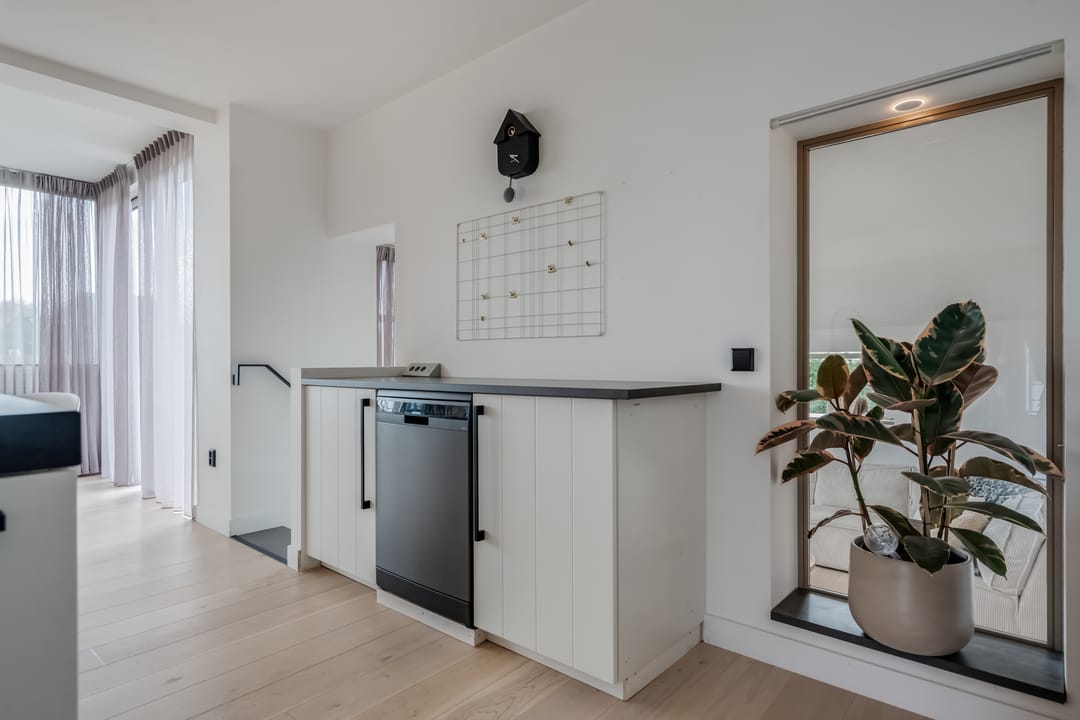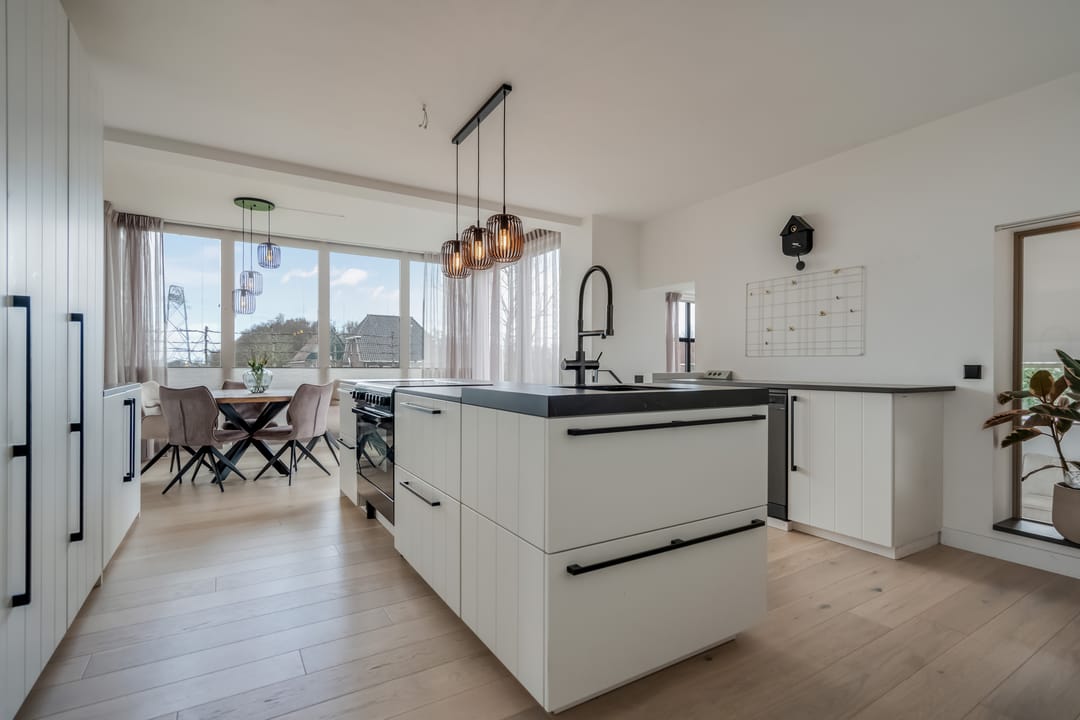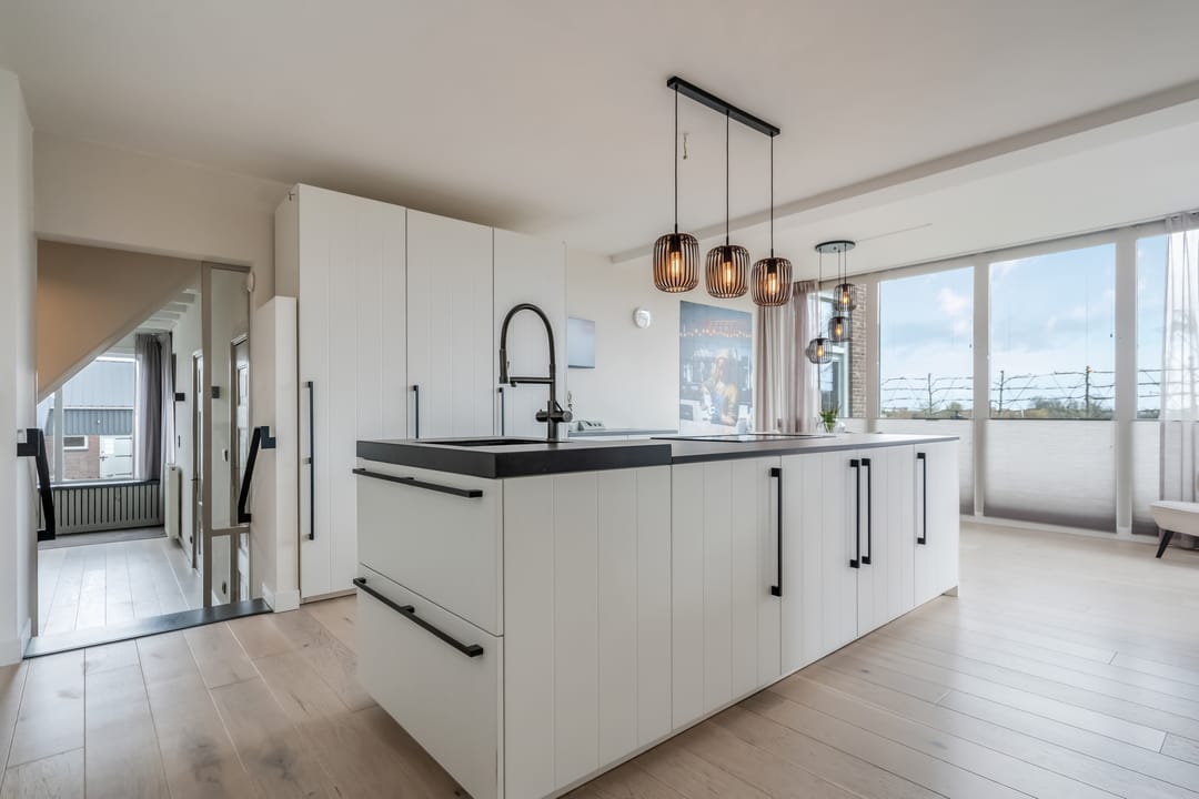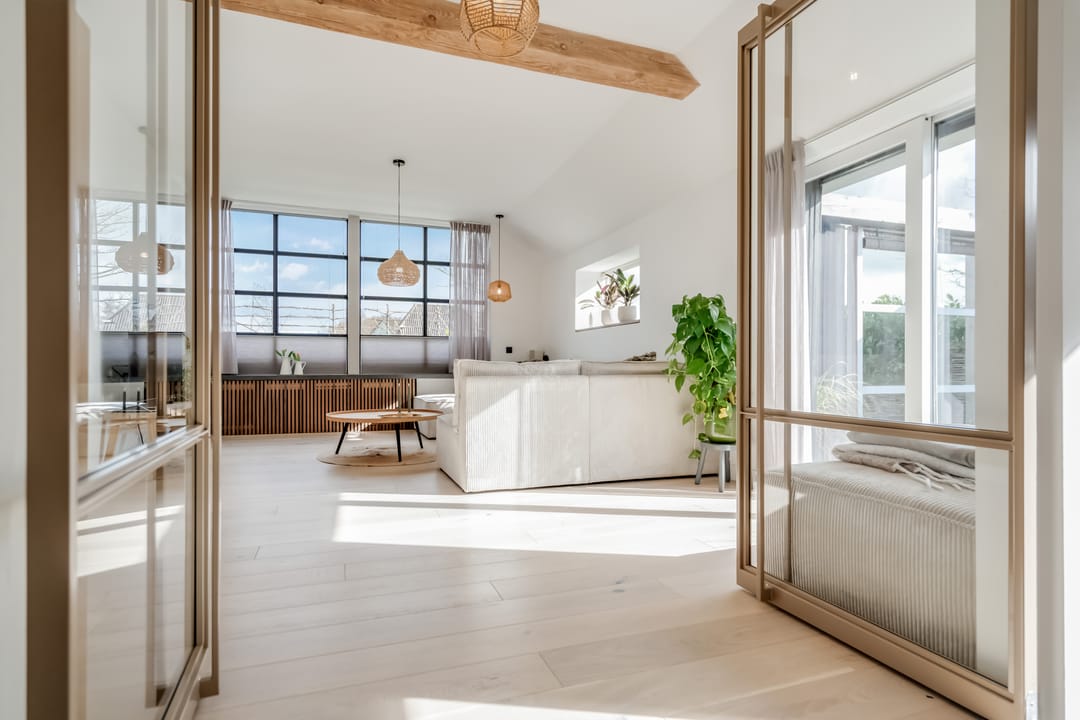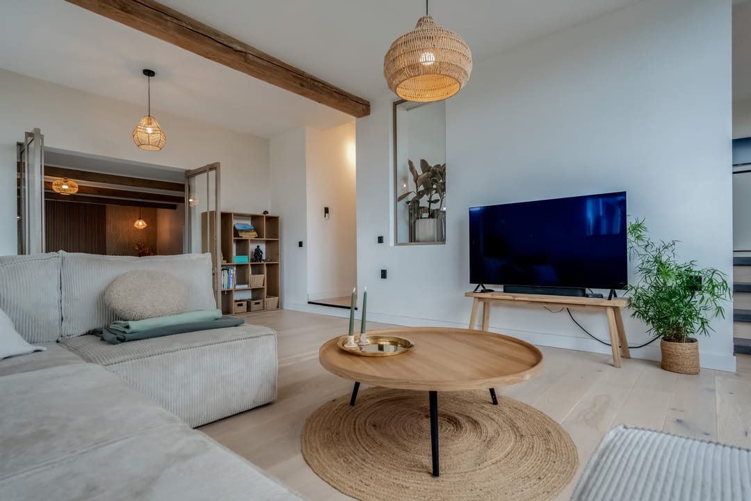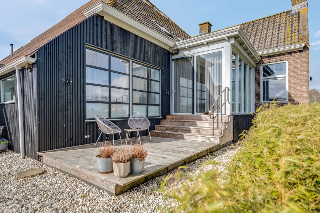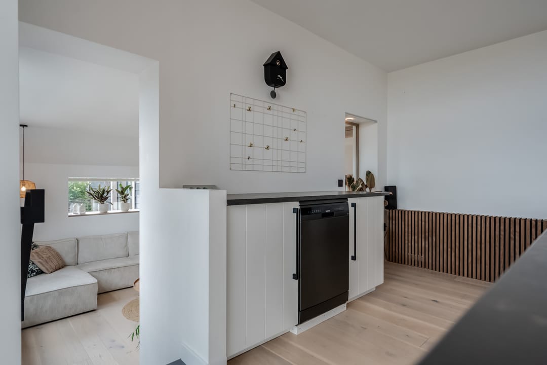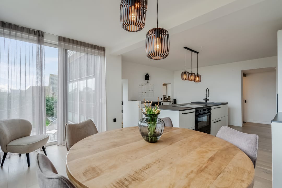 Begane grond: entree, royale hal met garderobe en authentieke details. Vanuit de hal bereikt u een modern toilet en een separate badkamer, voorzien van een ligbad met regendouche en handdouche, alsmede een wastafel met stijlvol meubel waarin de wasmachine en droger subtiel zijn geïntegreerd. De recent zeer smaakvol gemoderniseerde woonkeuken is gesitueerd in de serre van de boerderij en vormt een prachtige, lichte leefruimte. De keuken is uitgevoerd met een royaal kookeiland en voorzien van diverse inbouwapparatuur, waaronder een inductiekookplaat, oven, vaatwasser en een ruime koelkast. Via de schuifpui is er direct toegang tot de voortuin, waar je in alle rust kunt genieten van het vrije uitzicht over het Friese landschap. De sfeervolle woonkamer aan de voorzijde is licht en ruim dankzij de vele raampartijen en staat in directe verbinding met de keuken. Via stijlvolle taatsdeuren bereik je de achterkamer, ingericht als tweede zithoek met een pelletkachel die zowel de voor- als achterkamer comfortabel kan verwarmen. De doorkijk tussen woonkamer en keuken zorgt voor een moderne, open en lichte uitstraling. Het geheel is verzorgd afgewerkt met gestucte wanden en een rustige, eigentijdse kleurstelling. Aan de zijkant van de boerderij bevindt zich een tweede schuifpui die toegang biedt tot een heerlijk ruim terras, grenzend aan een royaal gras- en speelveld. Daarnaast is er een gedeeltelijk overdekte loungehoek gecreëerd, waar je beschut kunt genieten.
