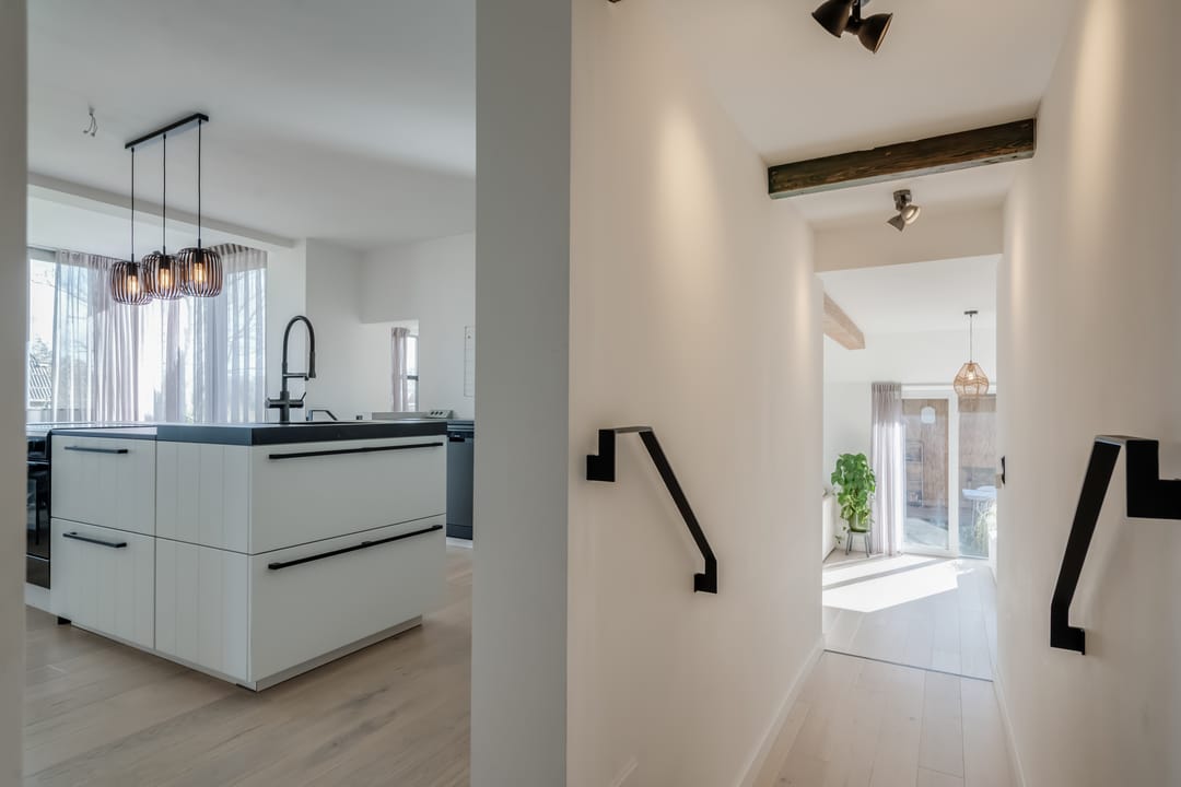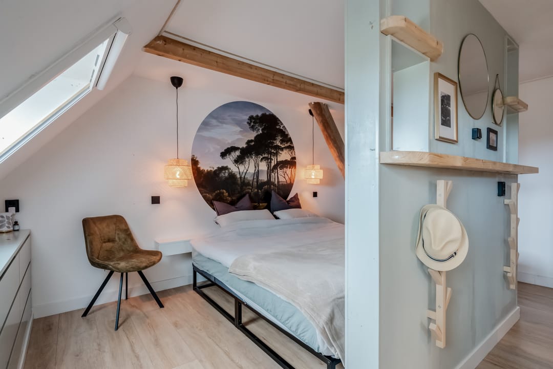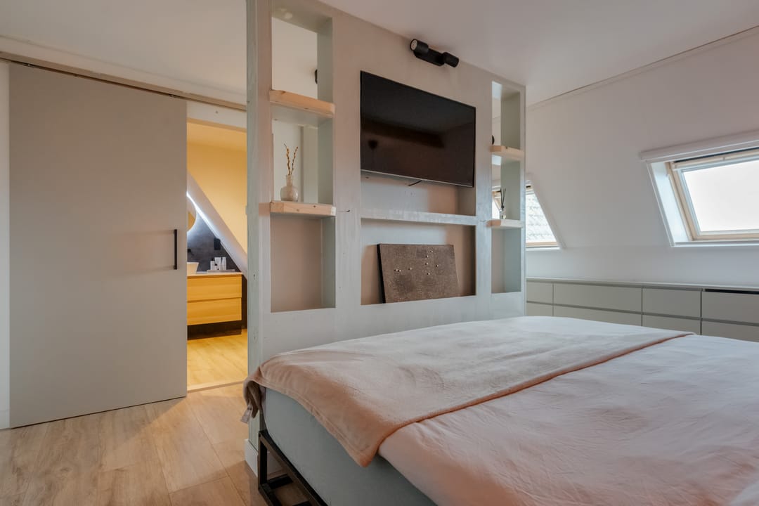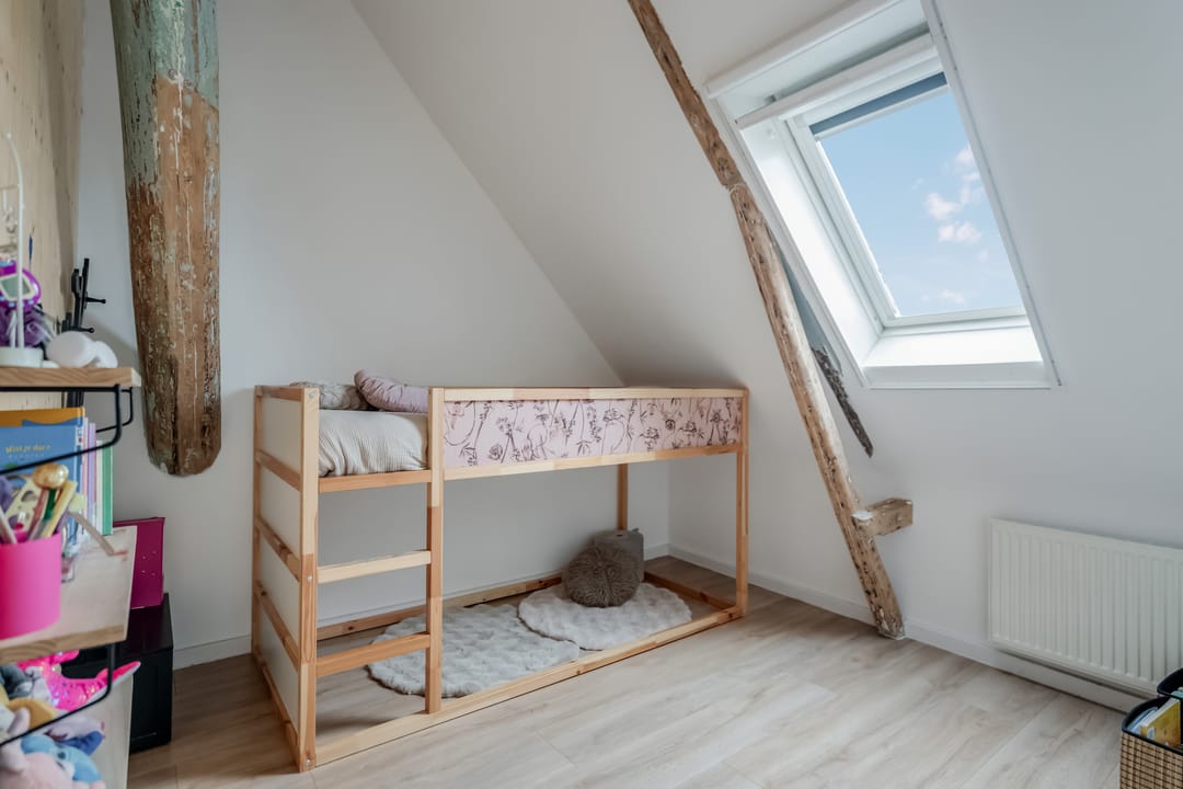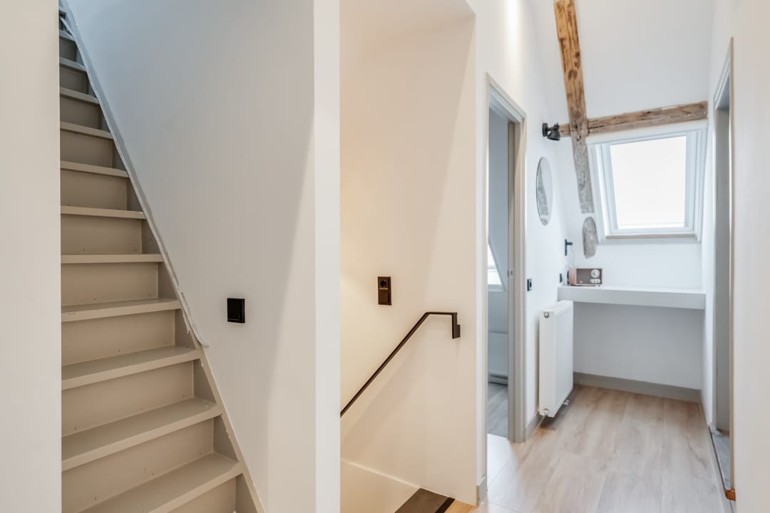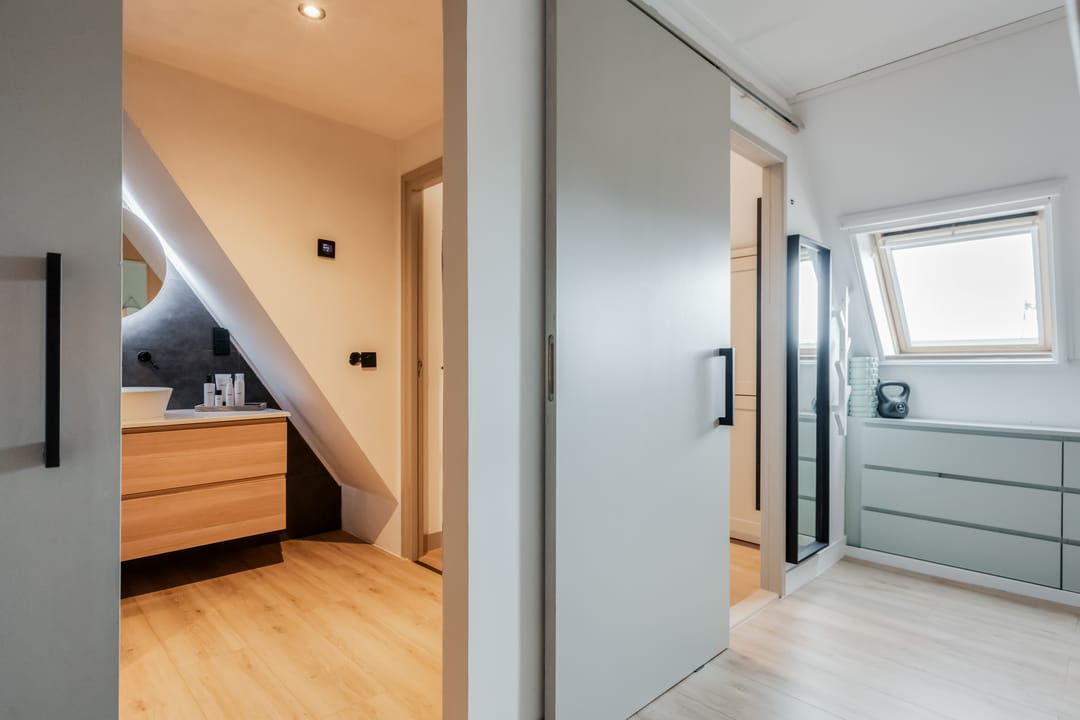 Eerste verdieping: bereikbaar middels vaste trap met geïntegreerde verlichting bereik je de overloop met toegang tot drie ruime slaapkamers (ca. 16m2/13m2 en 7m2), waarbij de zichtbare gebinten zorgen voor een karakteristieke sfeer. De ouderslaapkamer beschikt over een directe verbinding met de moderne en smaakvolle badkamer, voorzien van modern douche, smaakvolle wastafelkom met bijbehorend meubel, spiegel met geïntegreerde verlichting, zwevend toilet en elektrische vloerverwarming.