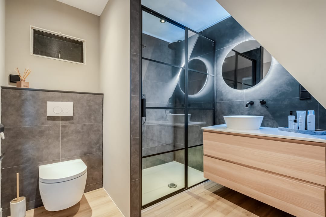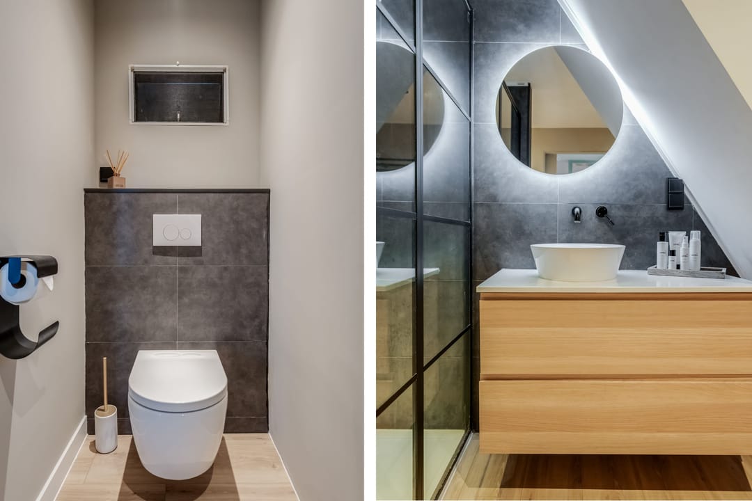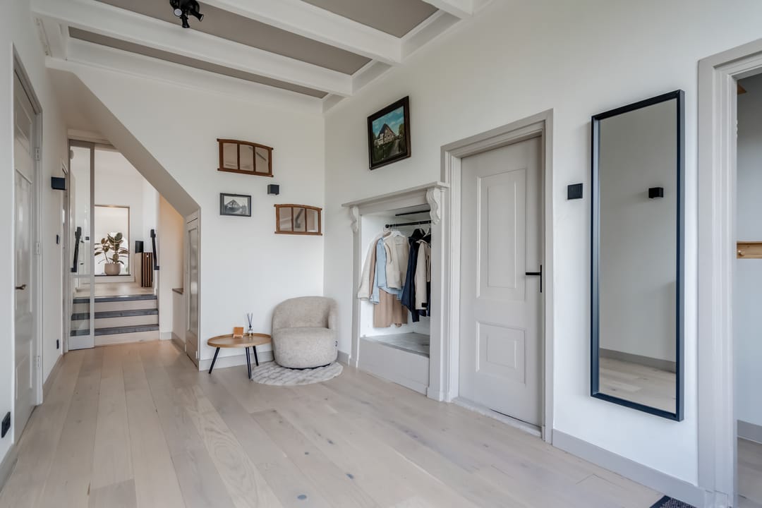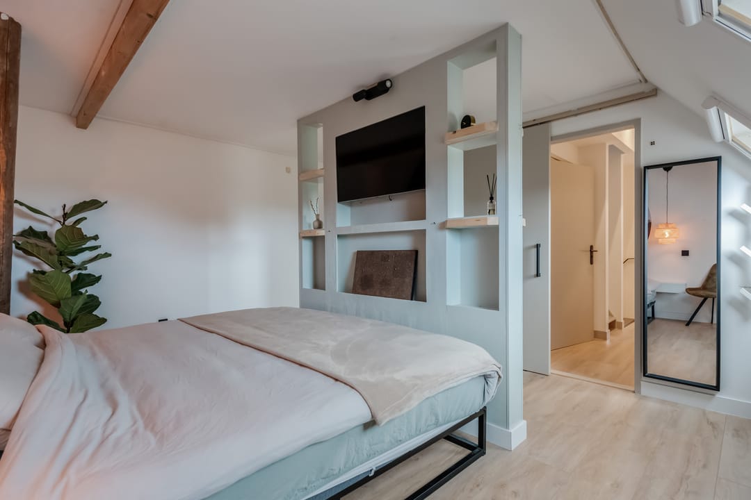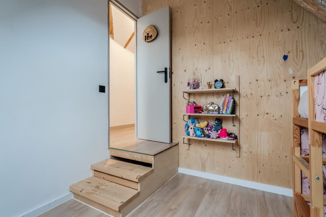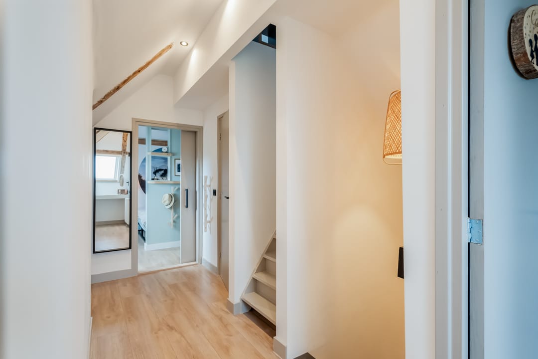 Eerste verdieping: bereikbaar middels vaste trap met geïntegreerde verlichting bereik je de overloop met toegang tot drie ruime slaapkamers (ca. 16m2/13m2 en 7m2), waarbij de zichtbare gebinten zorgen voor een karakteristieke sfeer. De ouderslaapkamer beschikt over een directe verbinding met de moderne en smaakvolle badkamer, voorzien van modern douche, smaakvolle wastafelkom met bijbehorend meubel, spiegel met geïntegreerde verlichting, zwevend toilet en elektrische vloerverwarming.