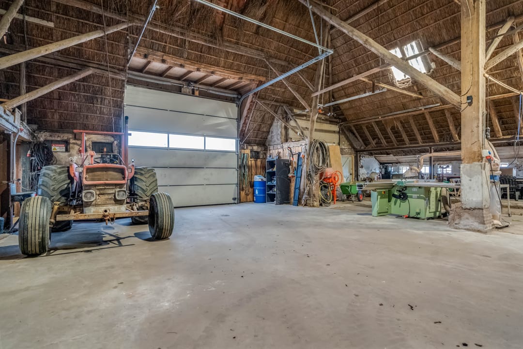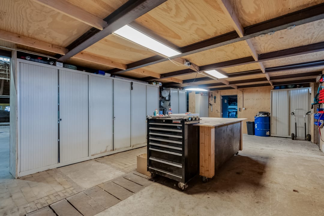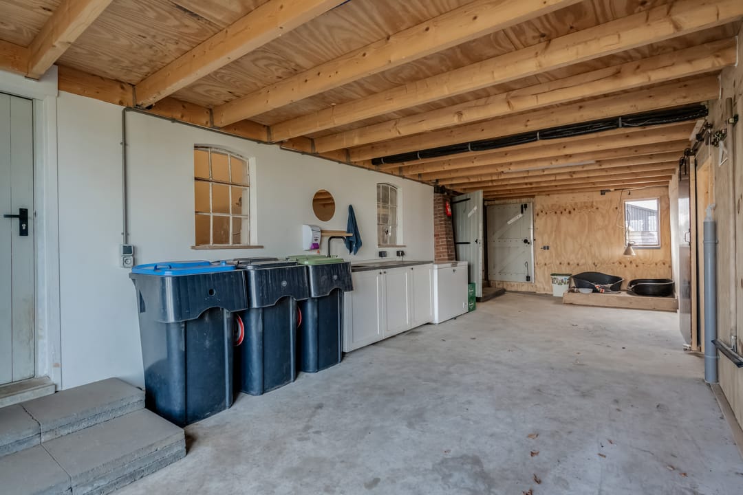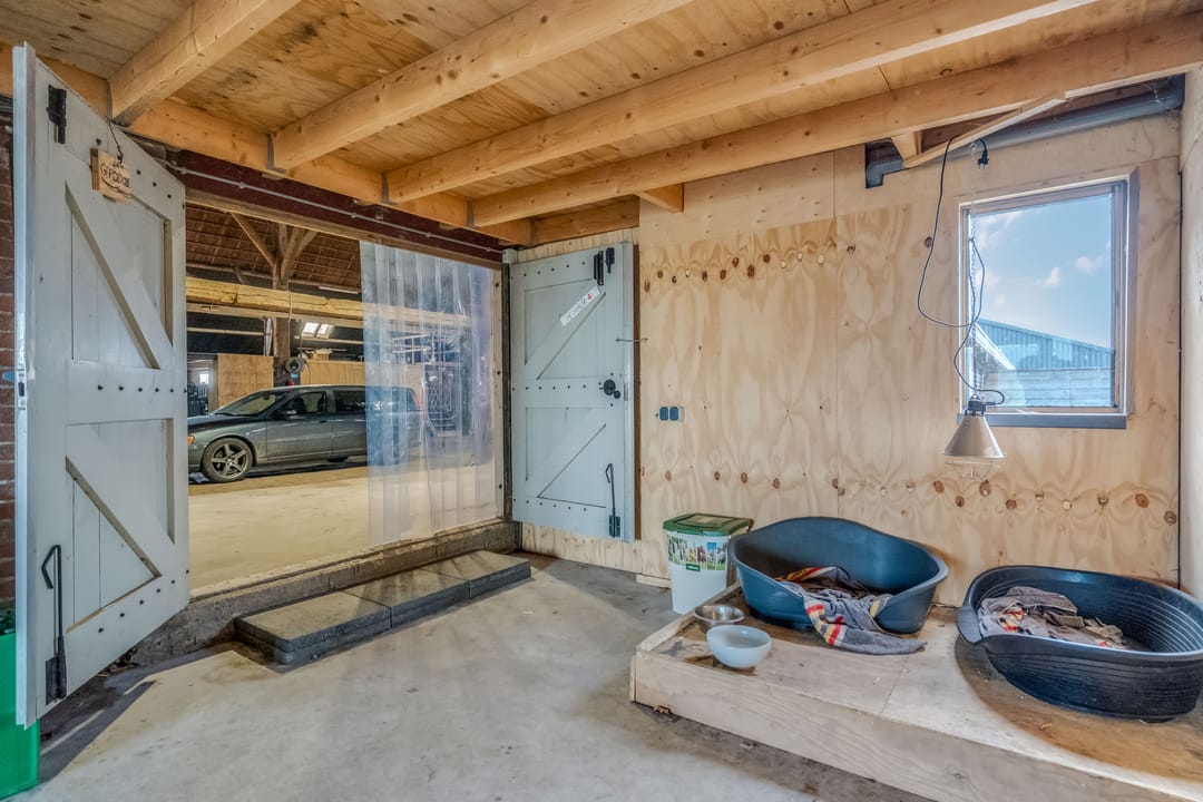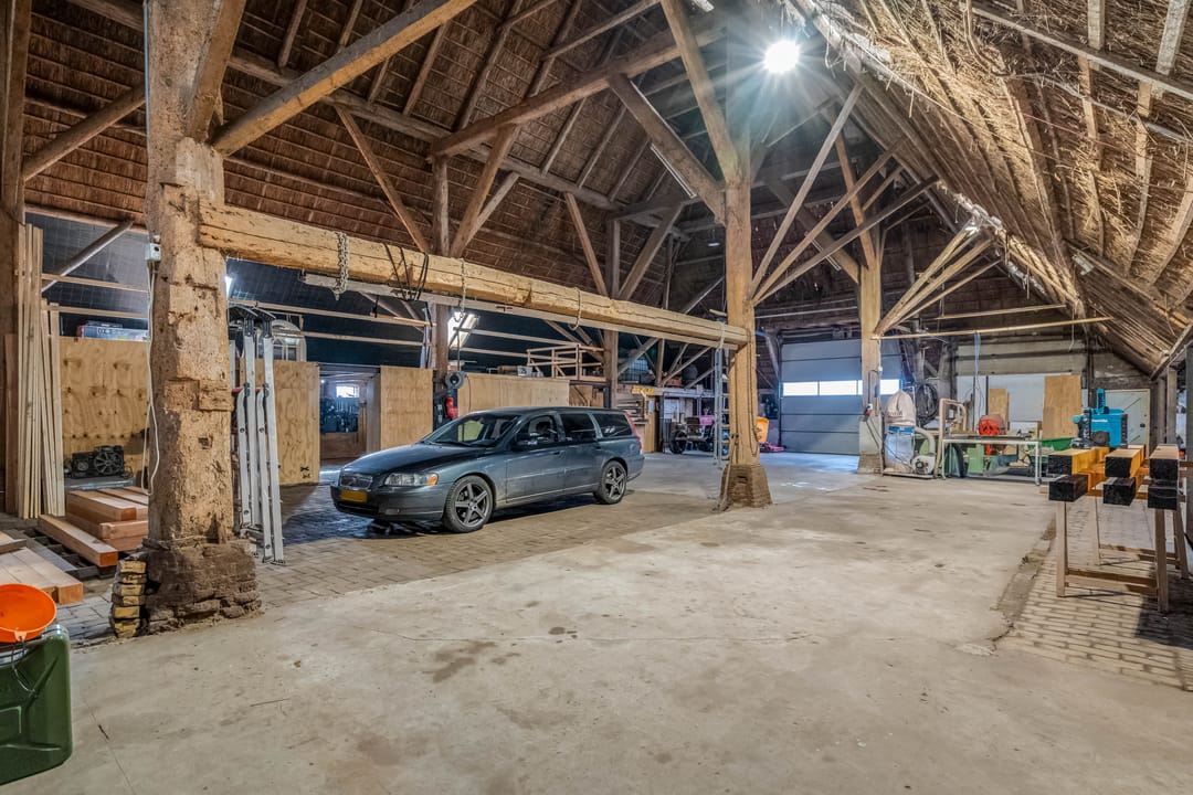 Het achterste gedeelte van de boerderij is ingericht als grote open ruimte met aan de achterzijde een op afstand bedienbare overheaddeur, deze ruimte is zeer geschikt voor bijvoorbeeld het stallen van caravans. Daarnaast zijn er separate opslagruimtes en een kippenverblijf met buitenruimte aanwezig.